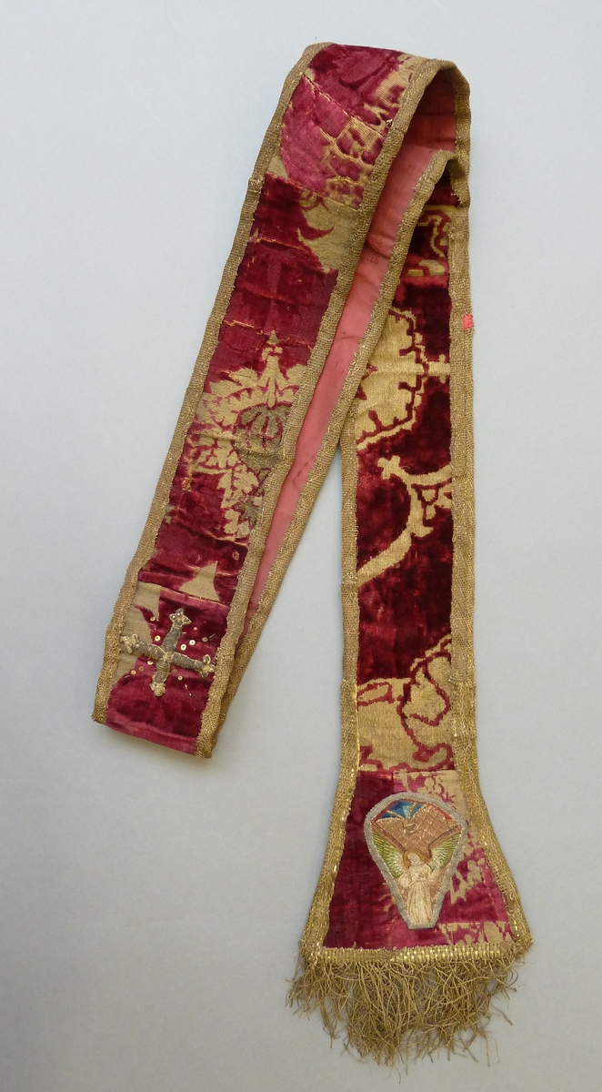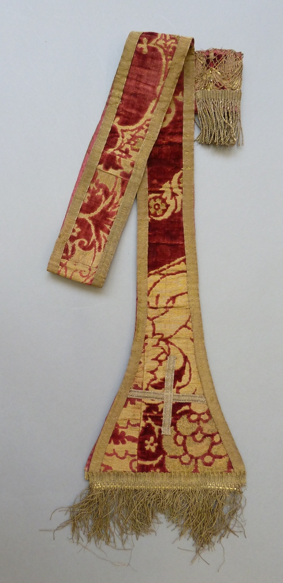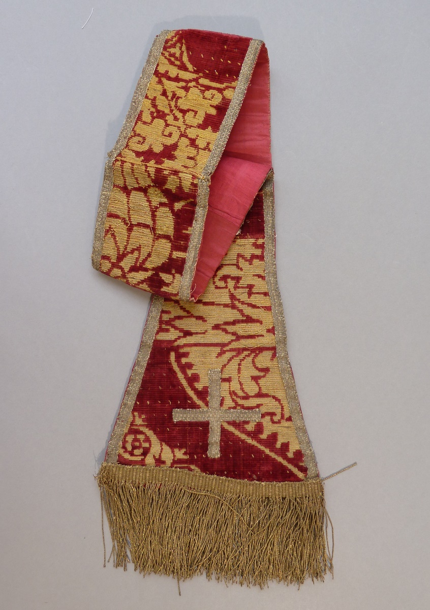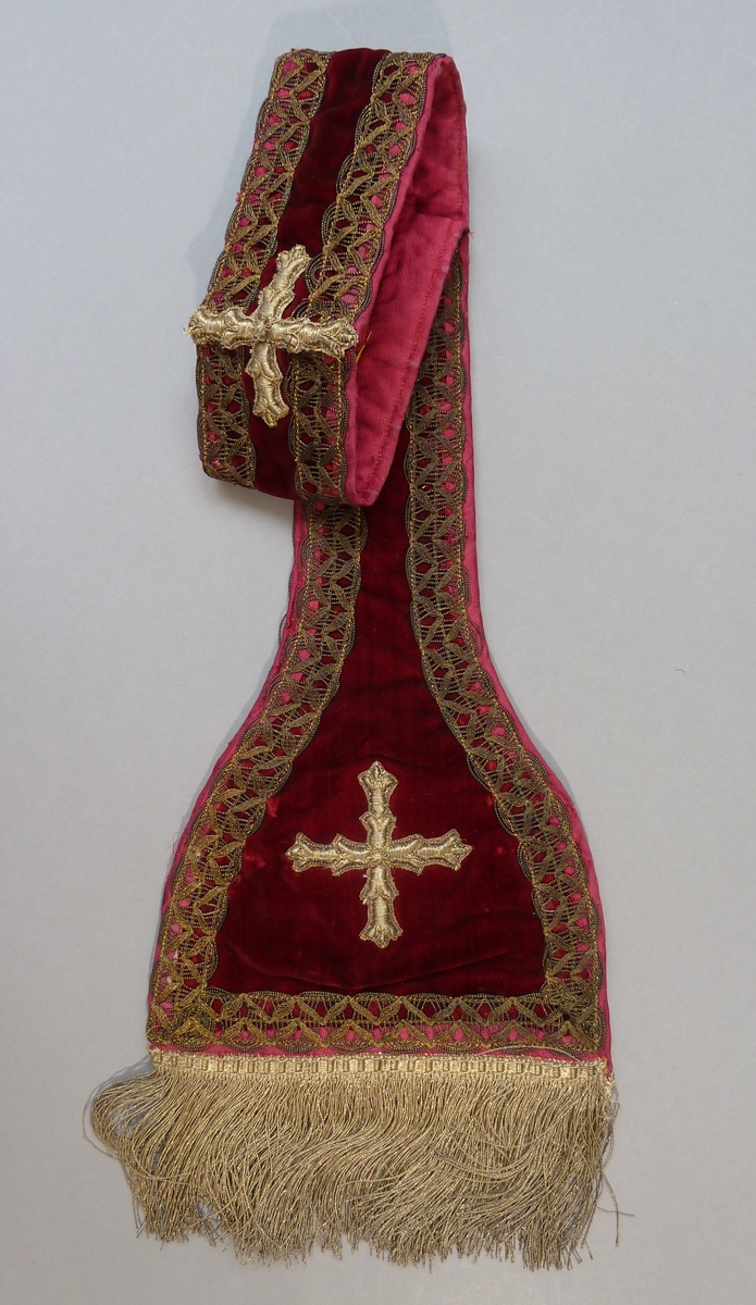 Rode stola met geborduurd leliekruisje, goudgalon kr...