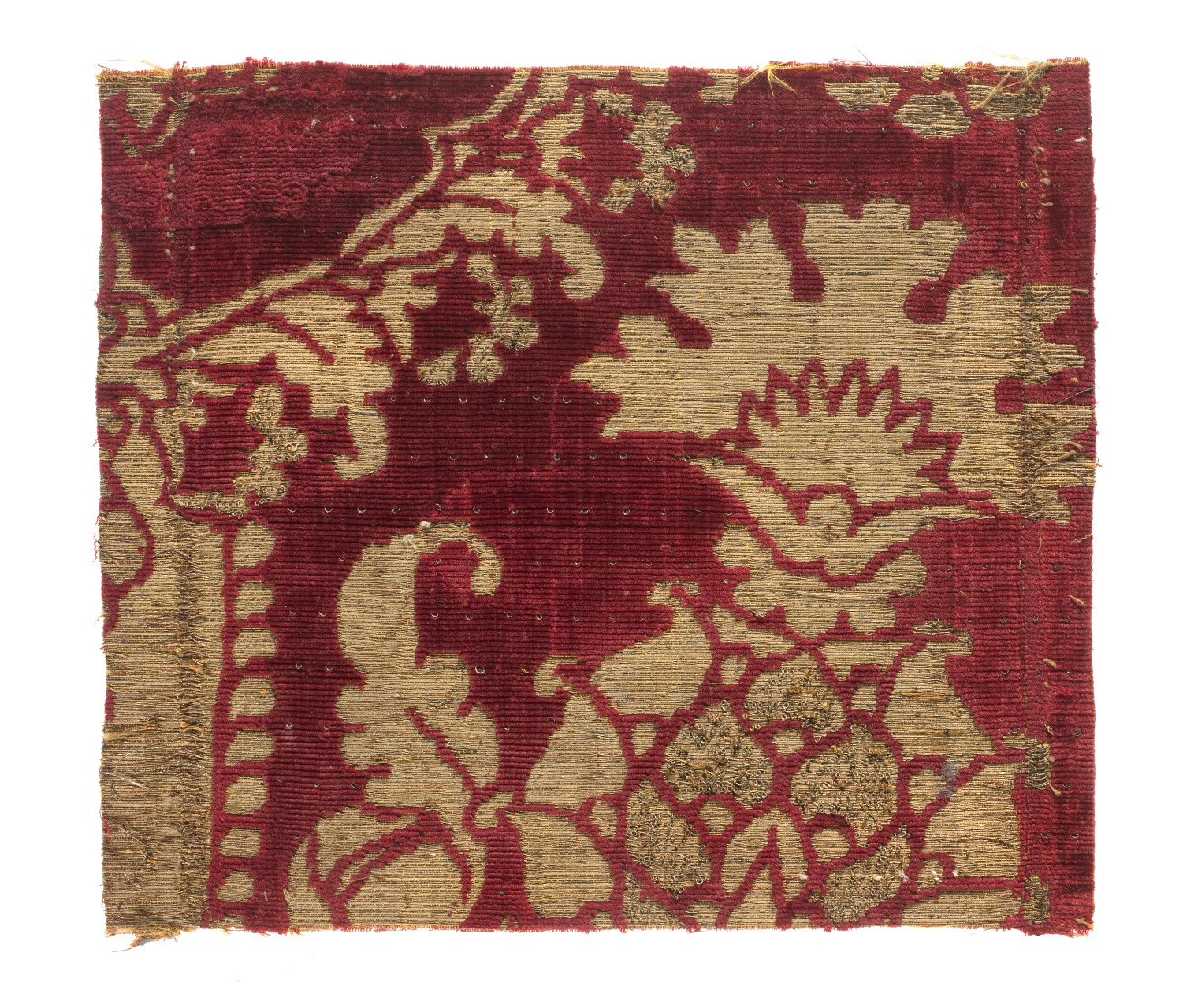 Rode mijter met ingeweven bloemen en ranken, afgezet...
