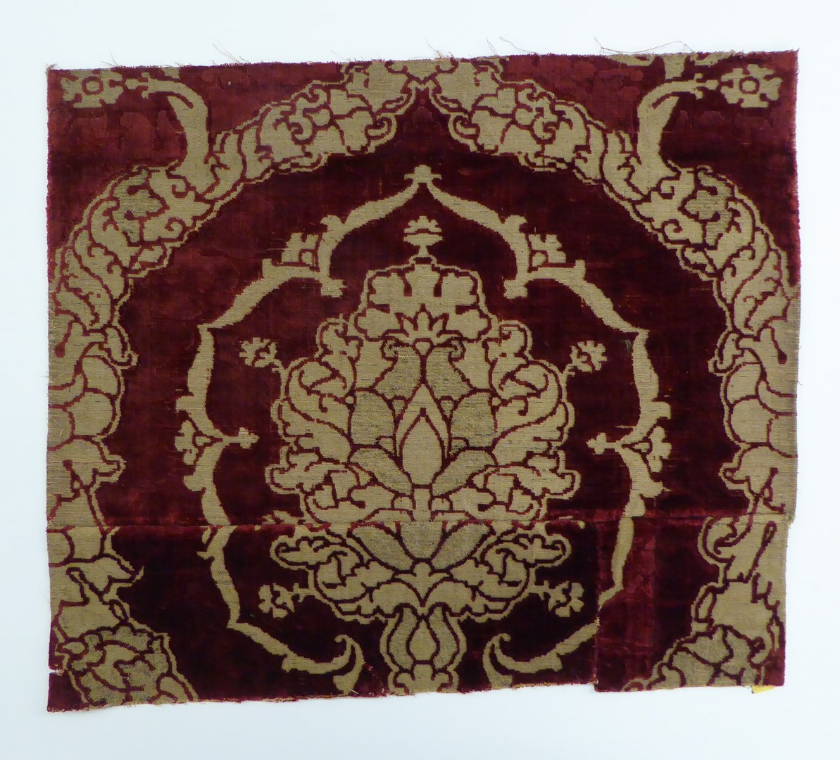 Rode antependiumstrook met goudfranje en met "Veni S...