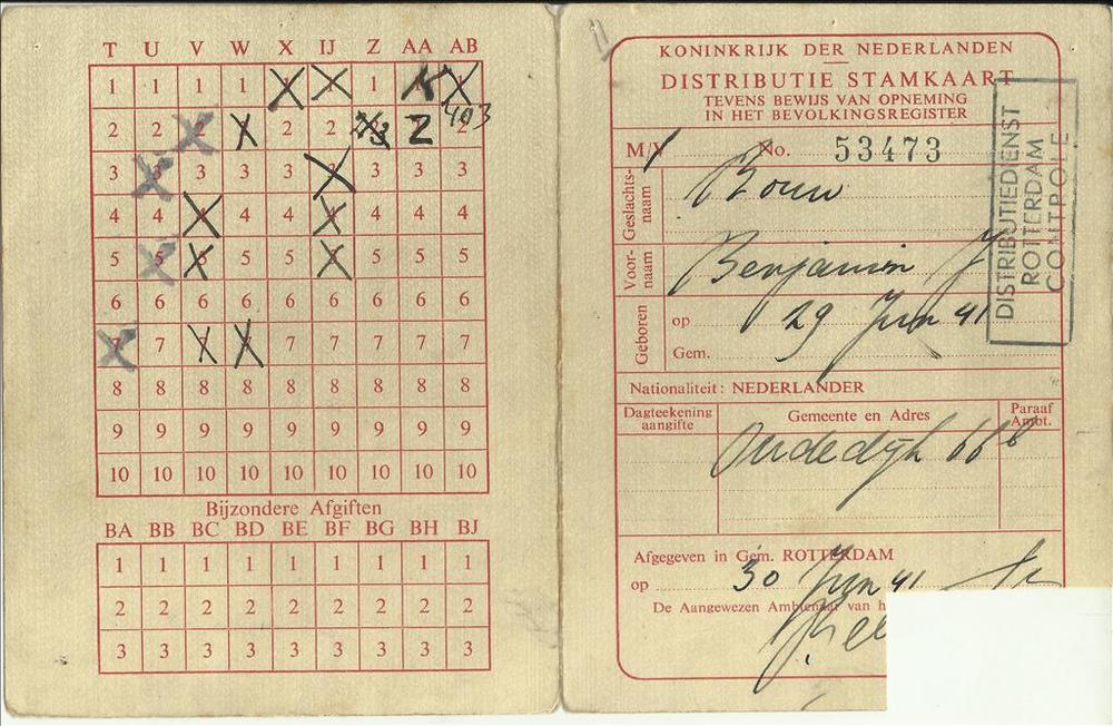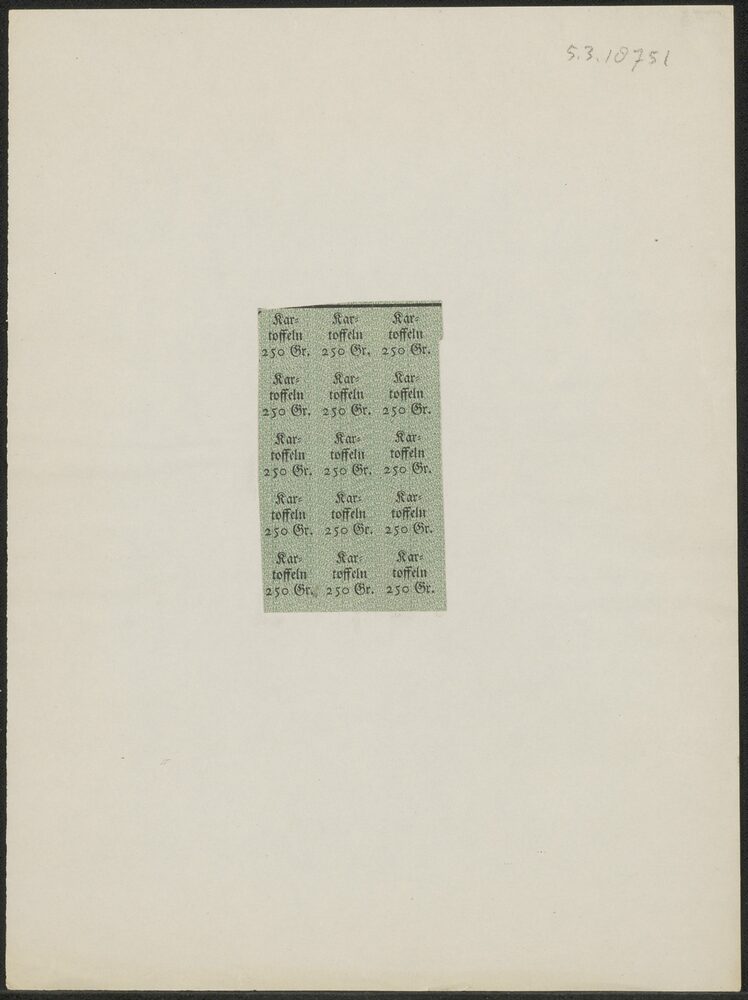 Opgeplakte Duitse distributiebonnen voor 250 gram aa...
