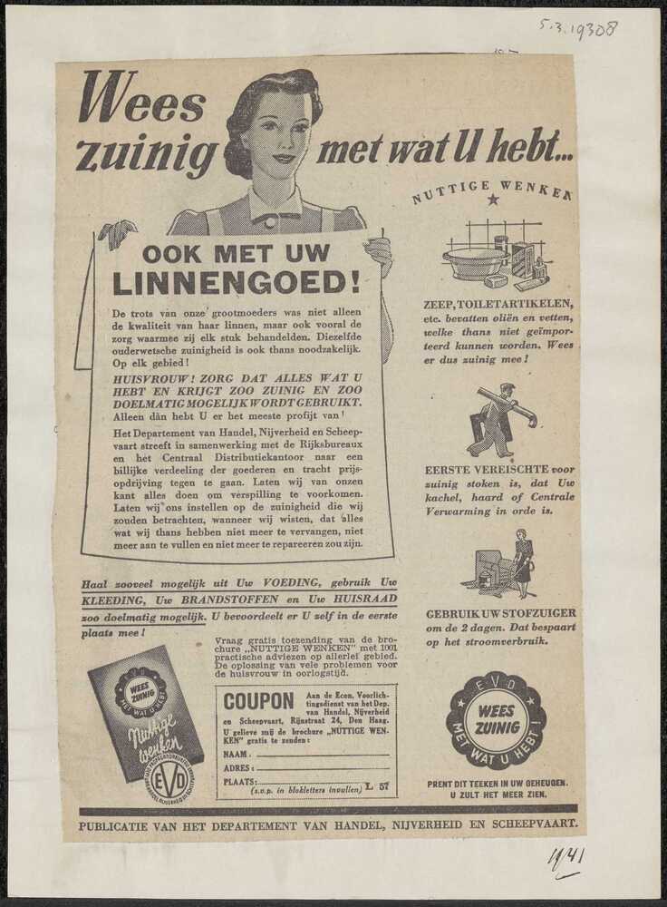 Vel met opgeplakte advertentie: "Wees zuinig met wat...