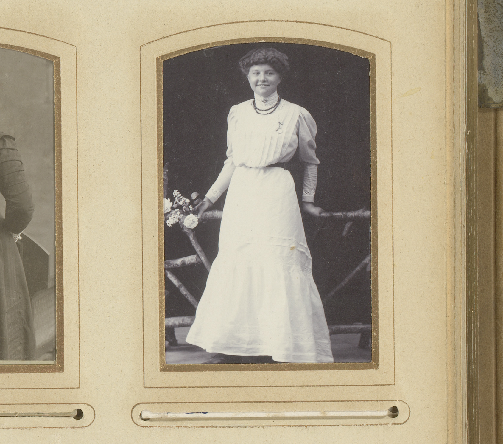 Portret van een vrouw, staand bij een hek met bloemen