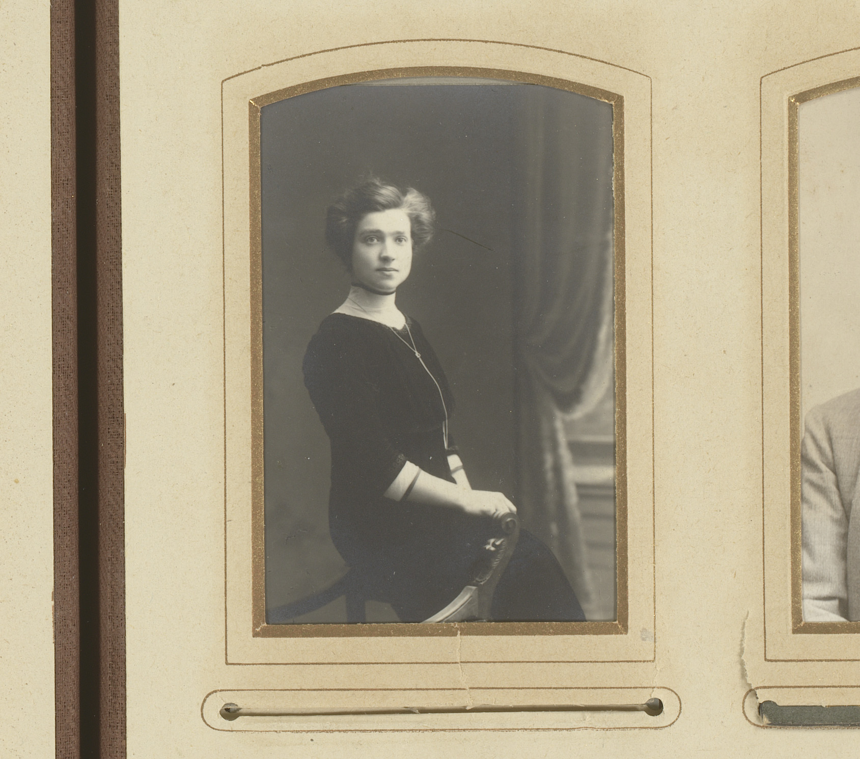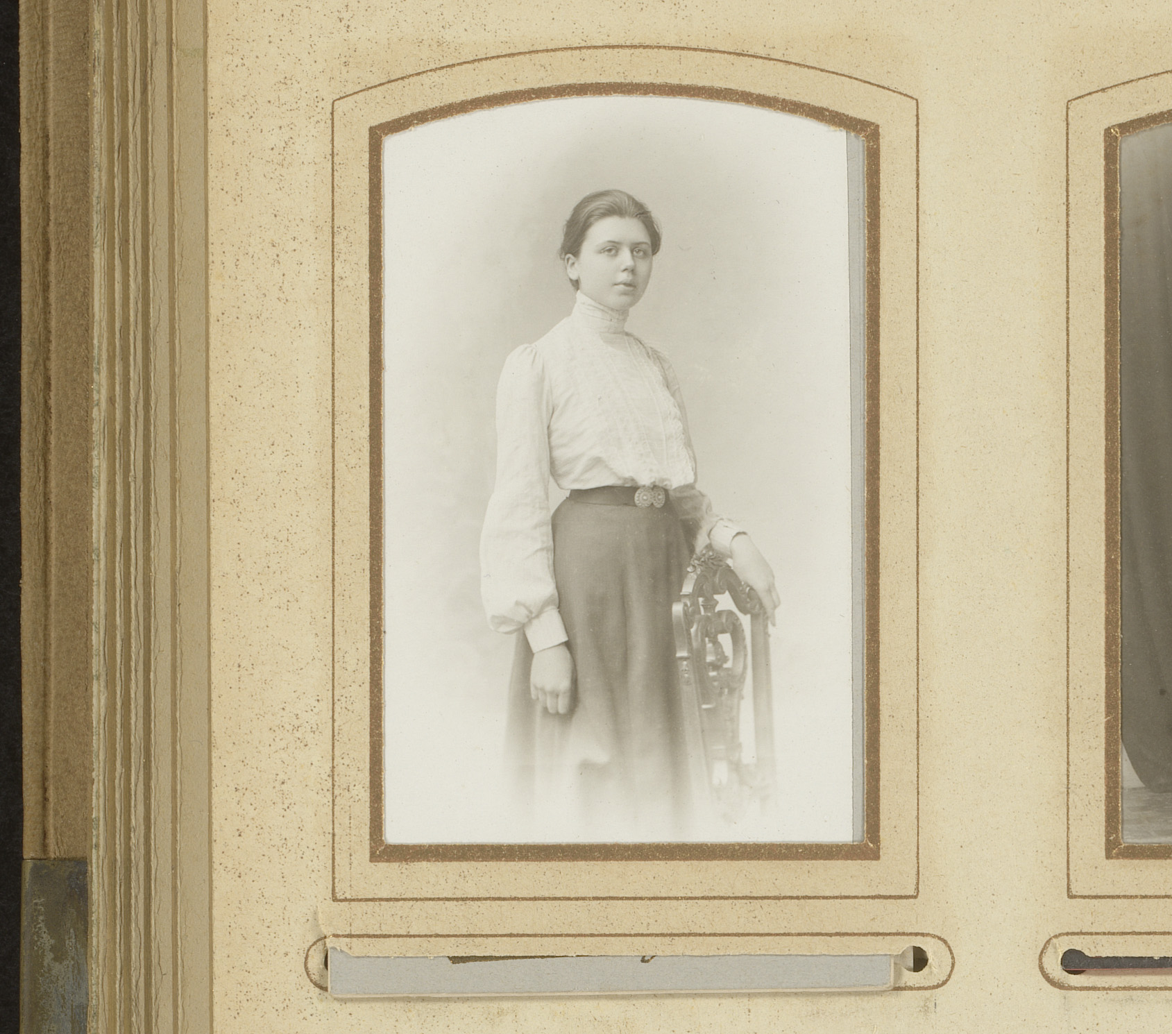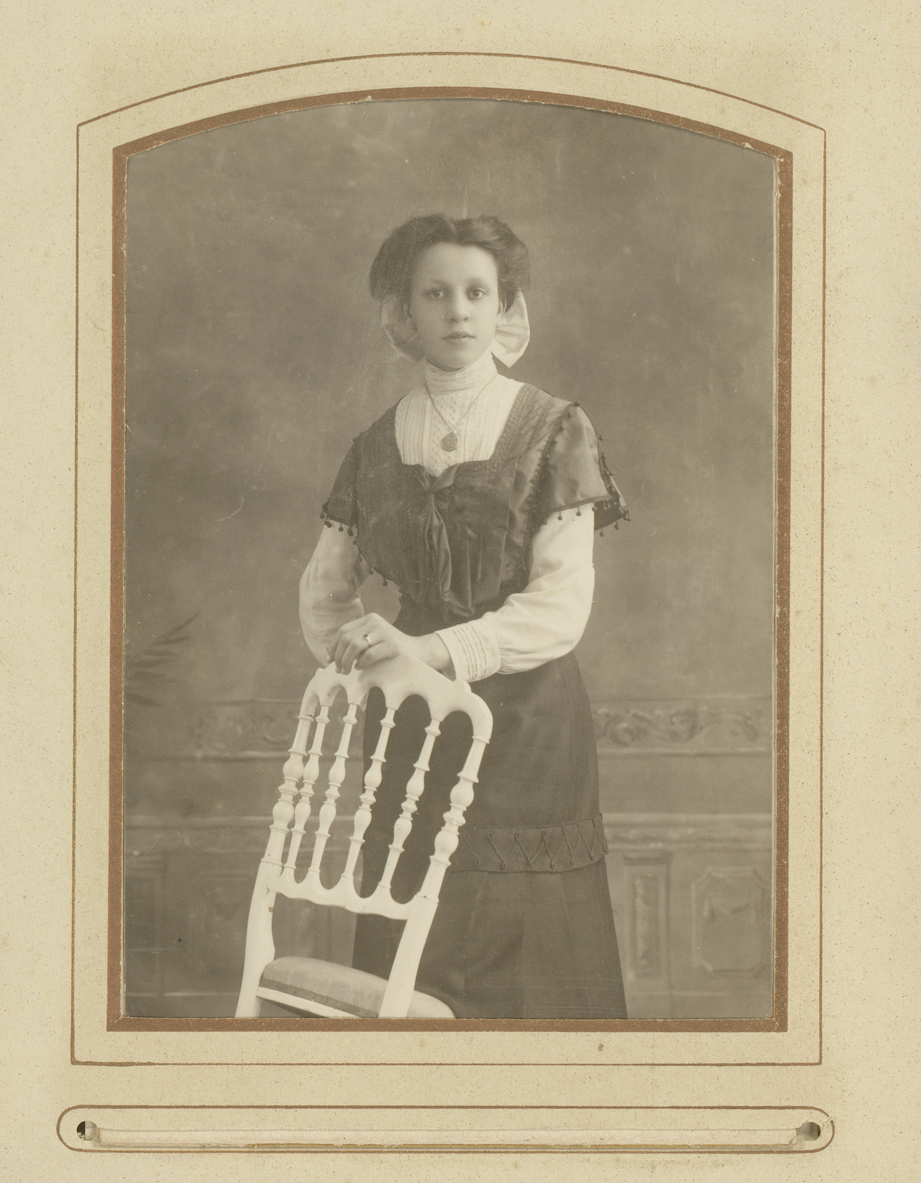 Portret van een jonge vrouw, staand bij een stoel
