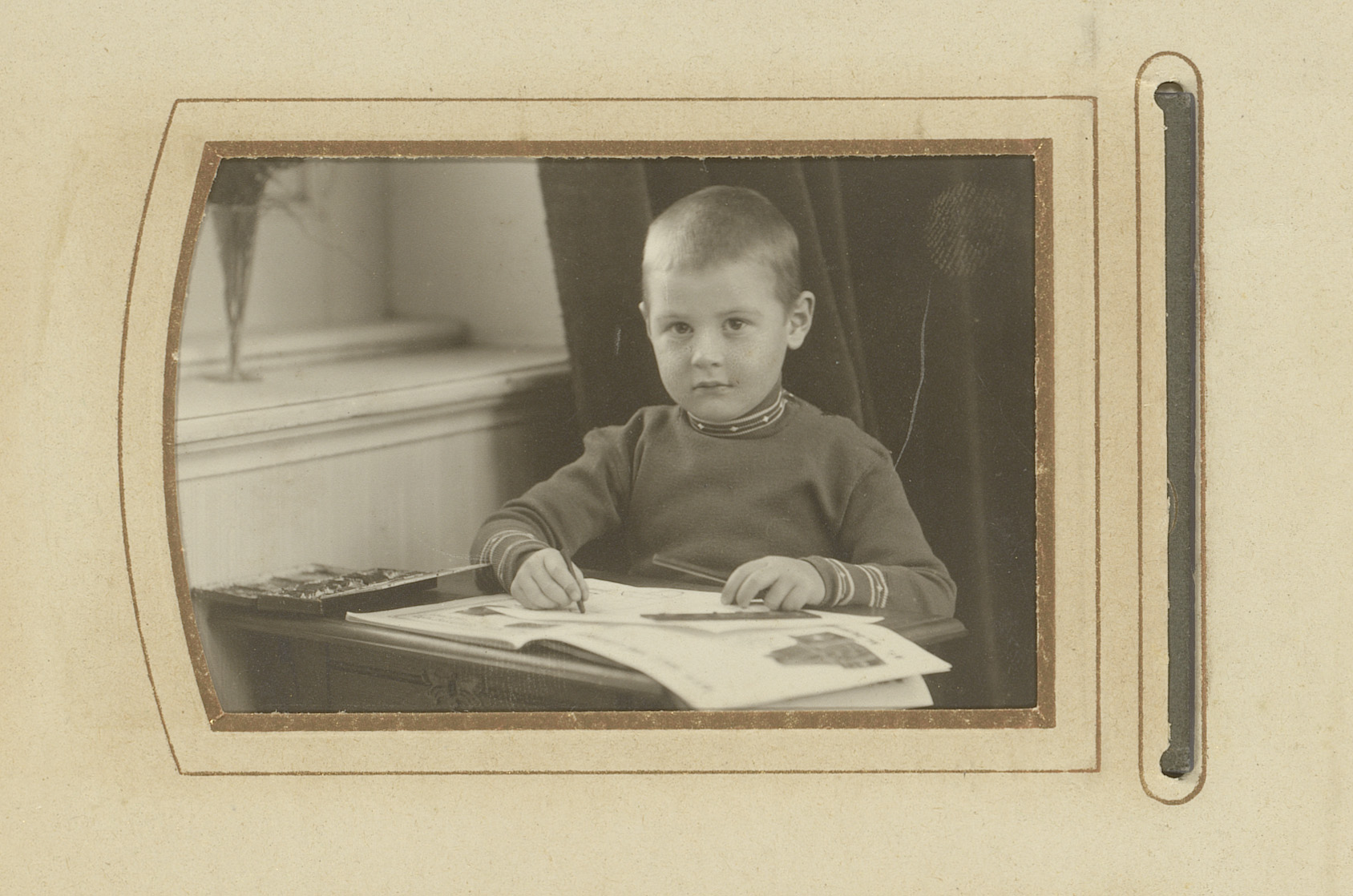Portret van een jongen, zittend aan een tafel met boek