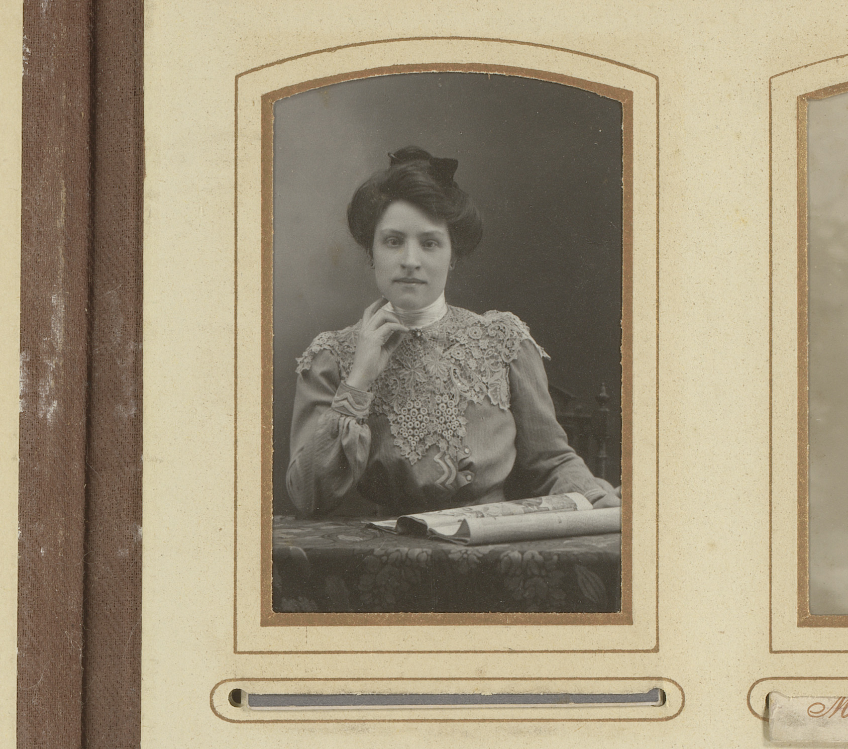 Portret van een vrouw, zittend aan een tafel met tij...