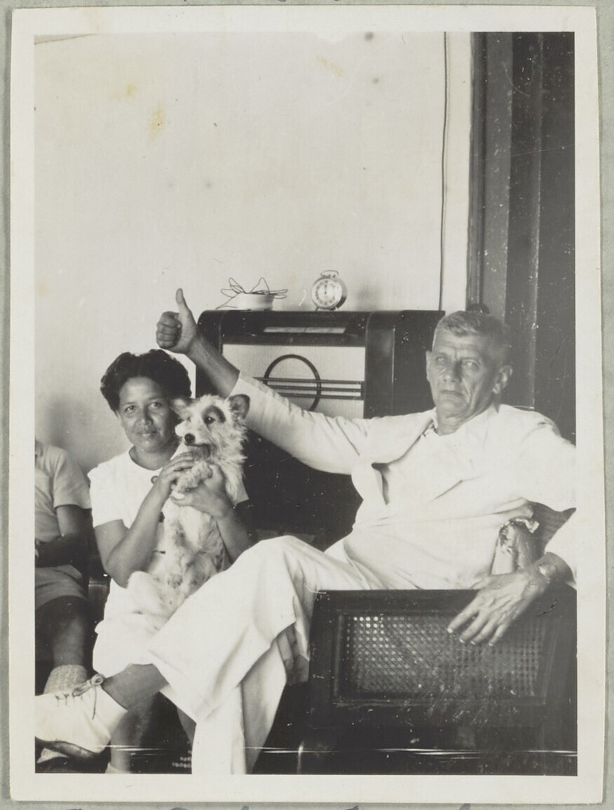 Europese man en javaanse vrouw met hondje in huiskam...