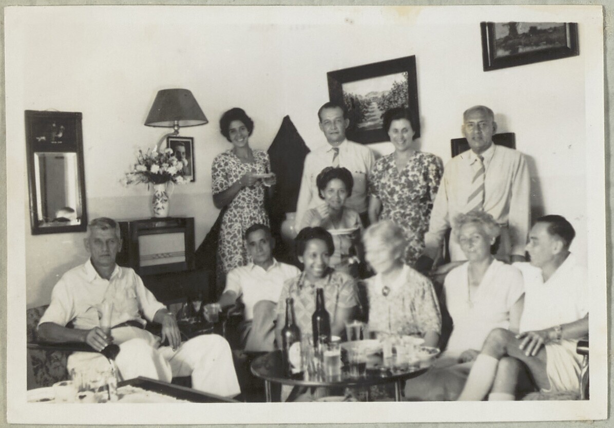 Groep Europese en Javaanse mannen en vrouwen in woon...