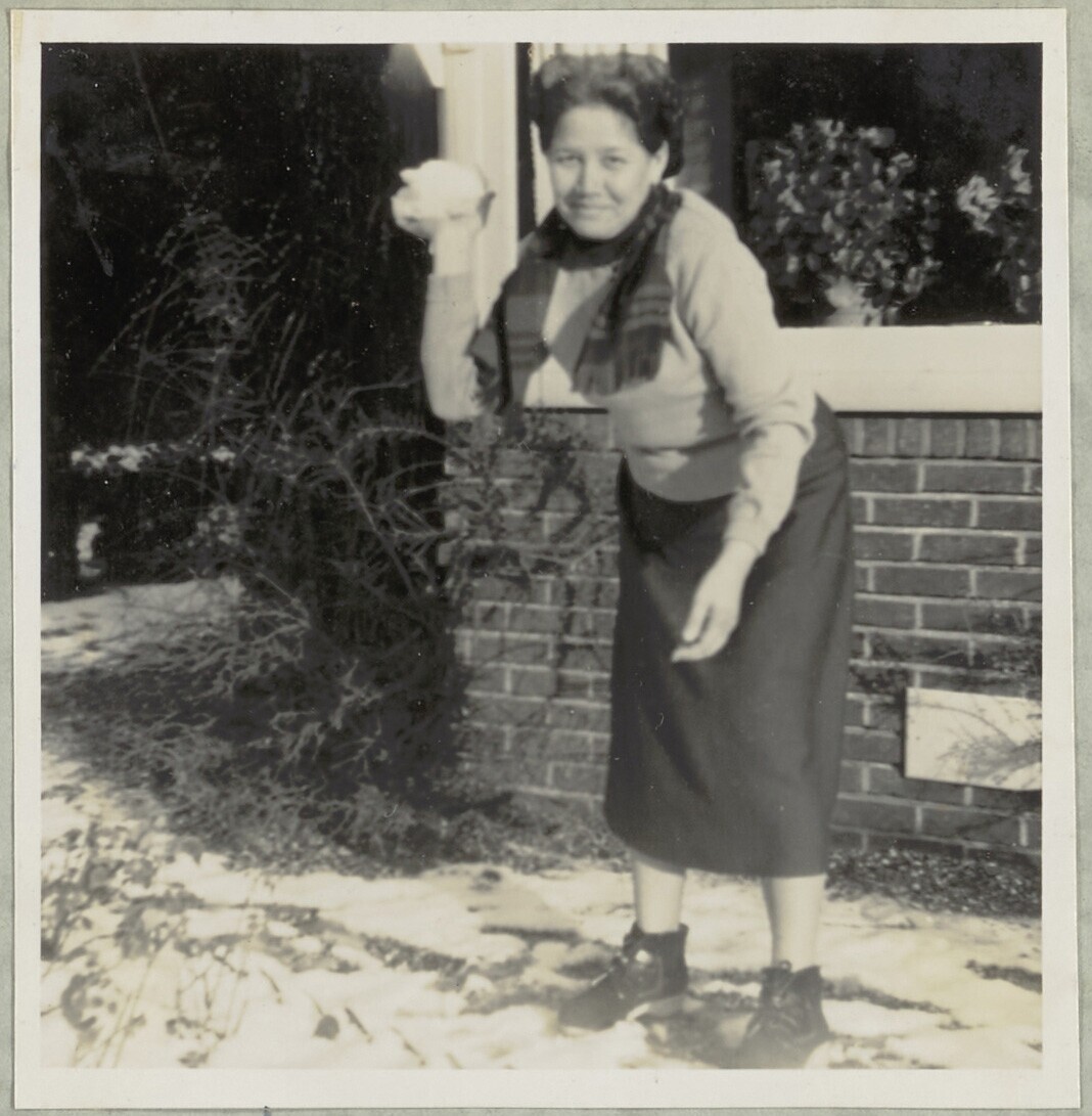 Javaanse vrouw met sneeuwbal voor huis in Deventer