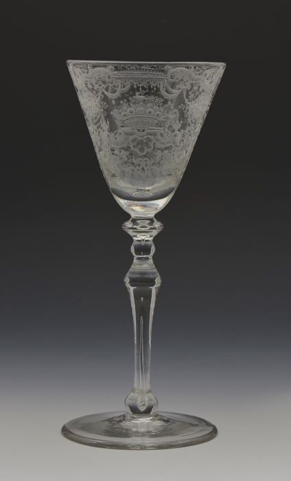 Kelkglas gegraveerd met "T´ / AMBAGT. VAN / COOL"