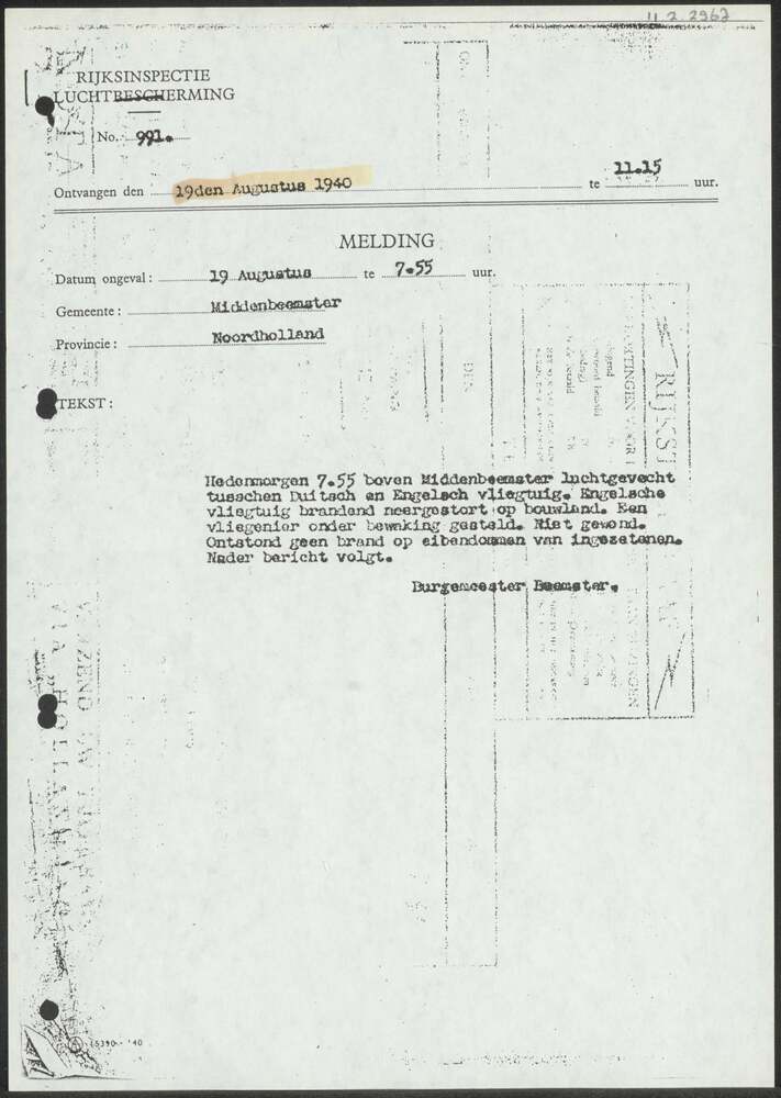 Melding van gemeente Middenbeemster 19-08-1940