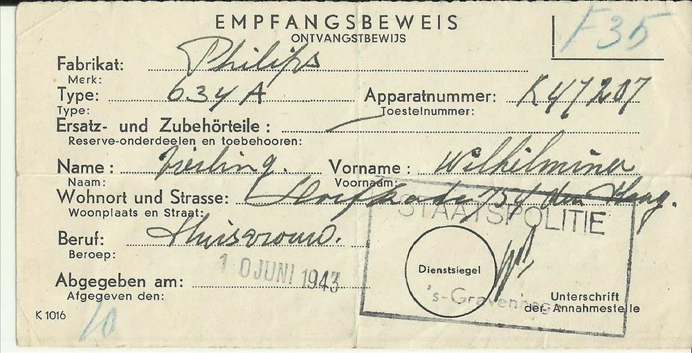 Ontvangstbewijs ( Empfangsbeweis ) van een radio van...