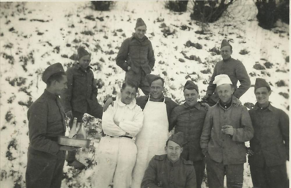 negen Nederlandse militairen en een kok in de sneeuw