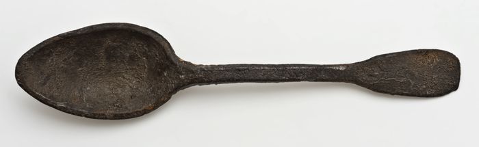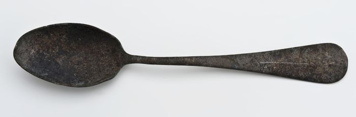Tinnen lepel met ovale bak, platte steel en twee kep...