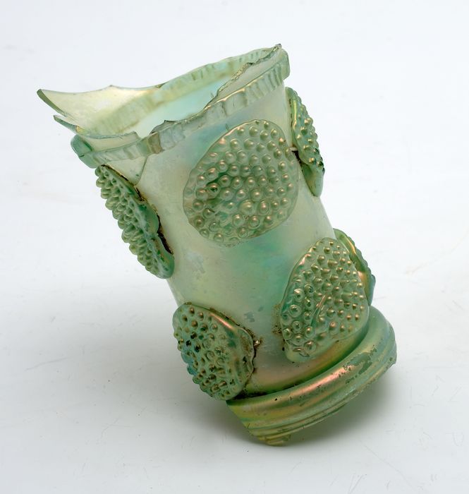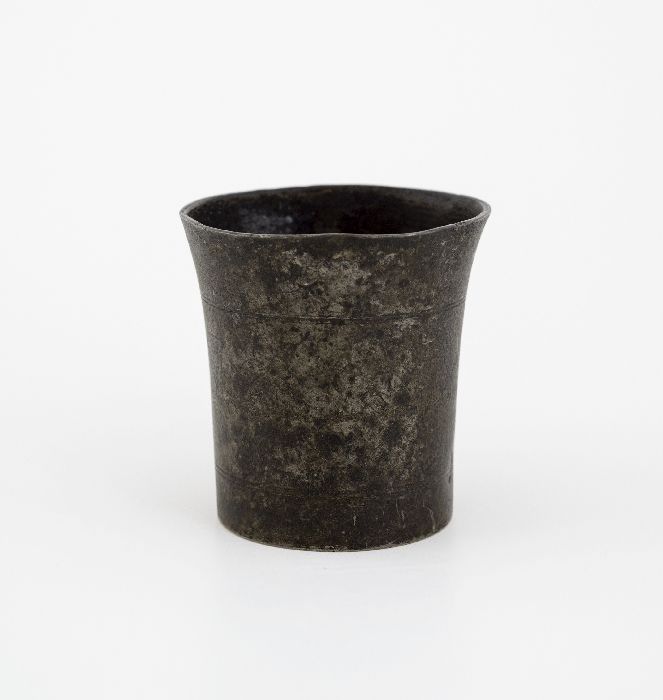 Cilindervormige tinnen beker met decoratie in reliëf