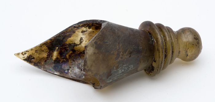 Steelfragment van tinnen lepel, gemerkt