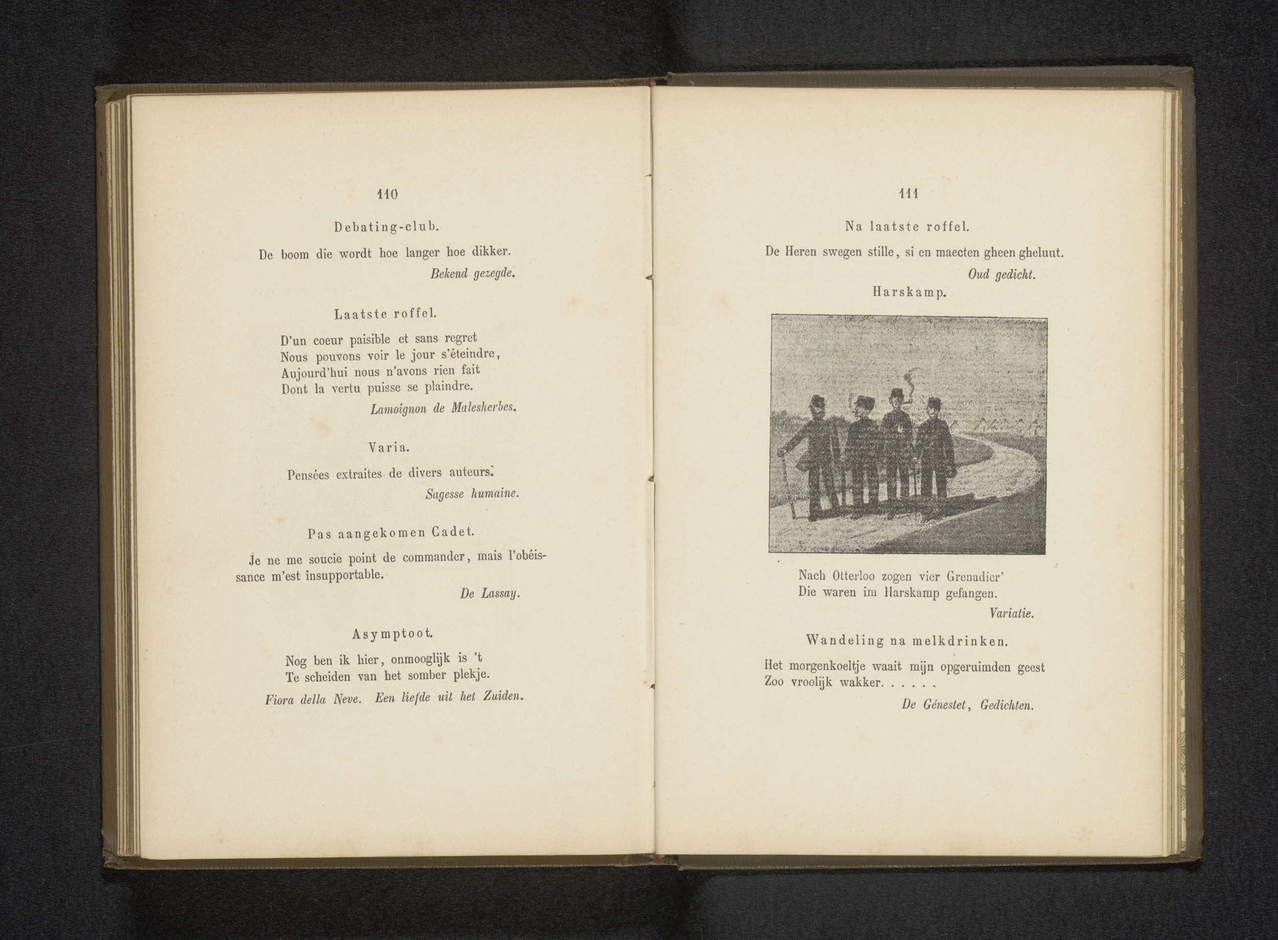 Reproductie van een tekening van vier soldaten op ee...