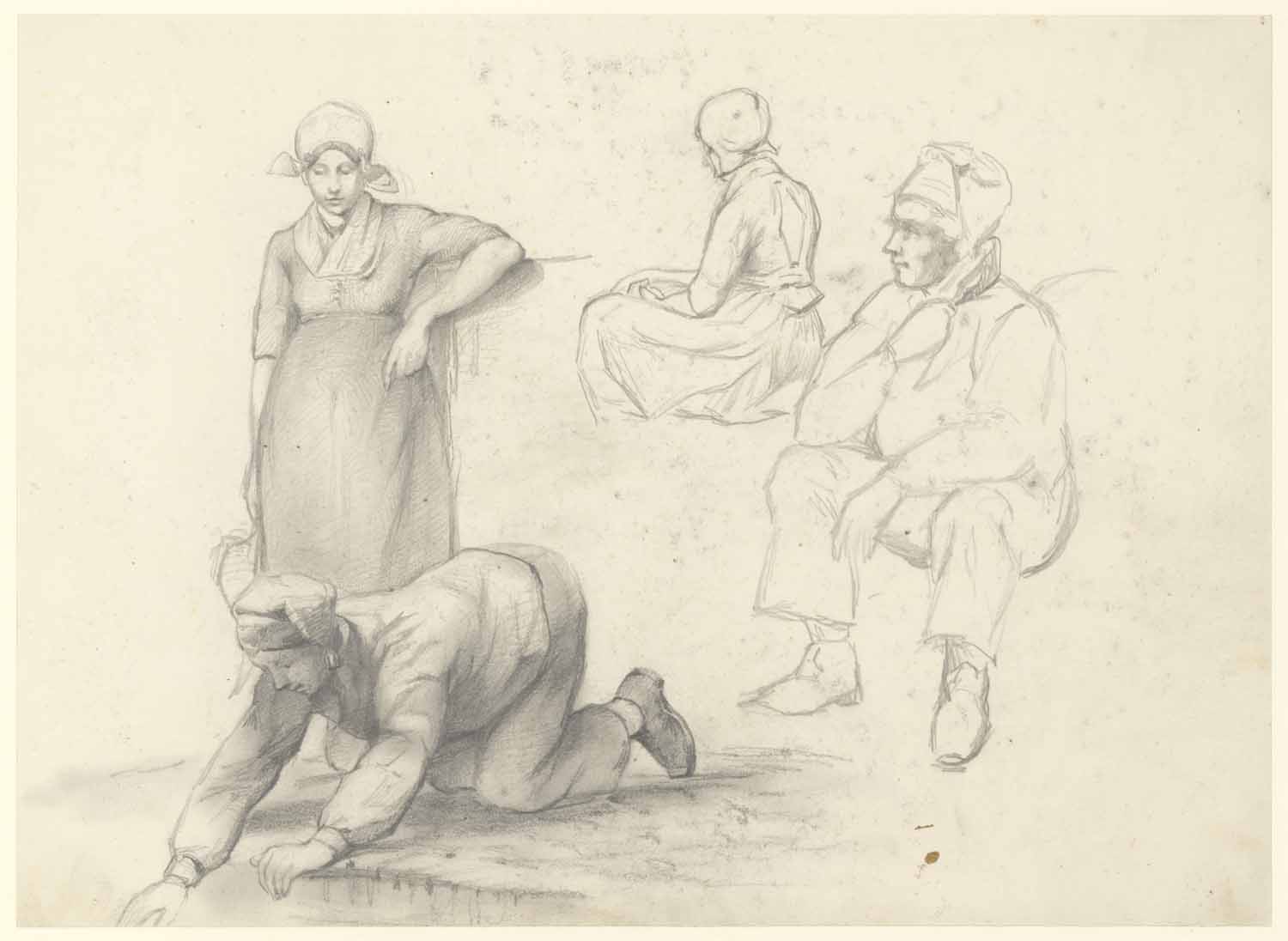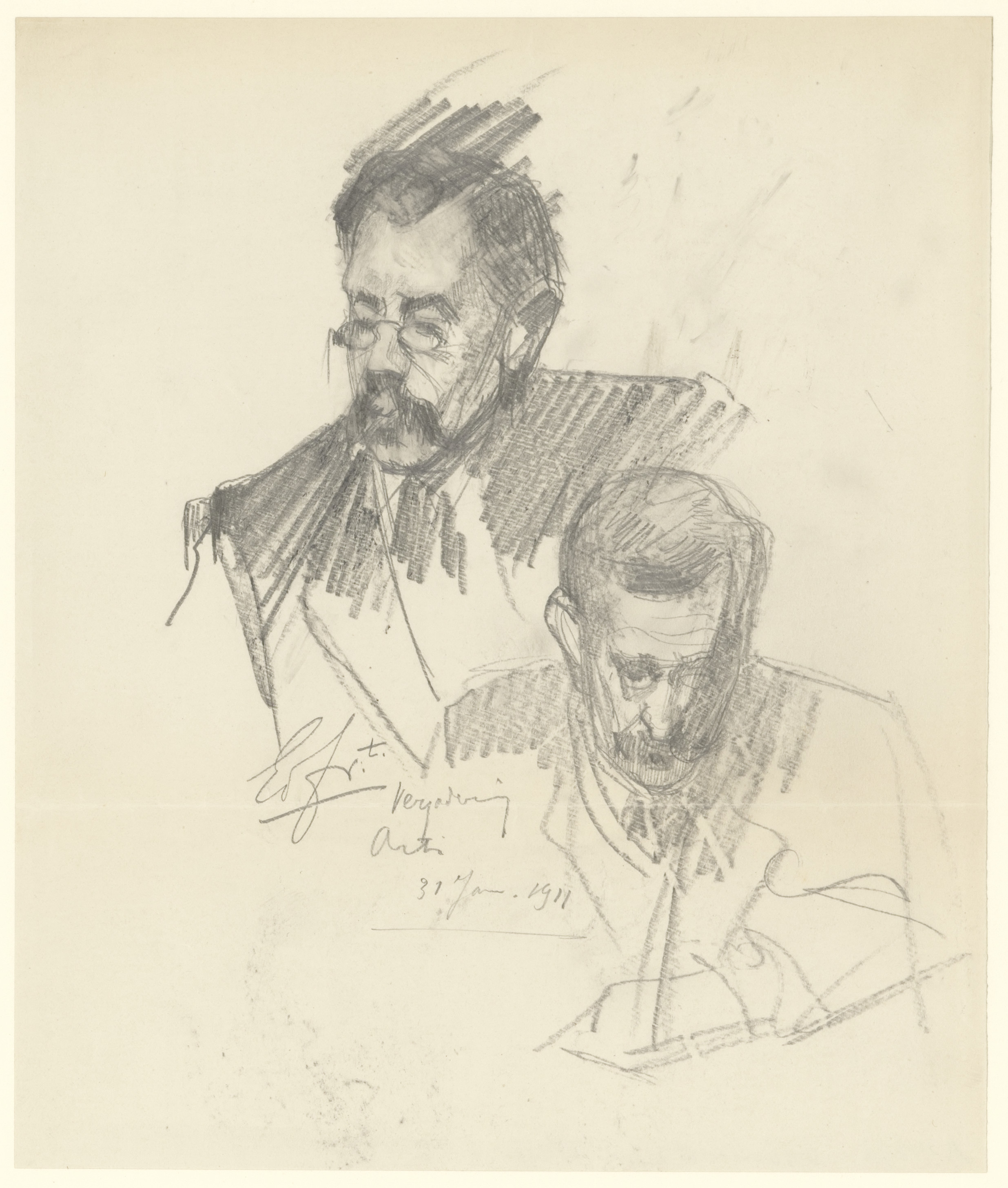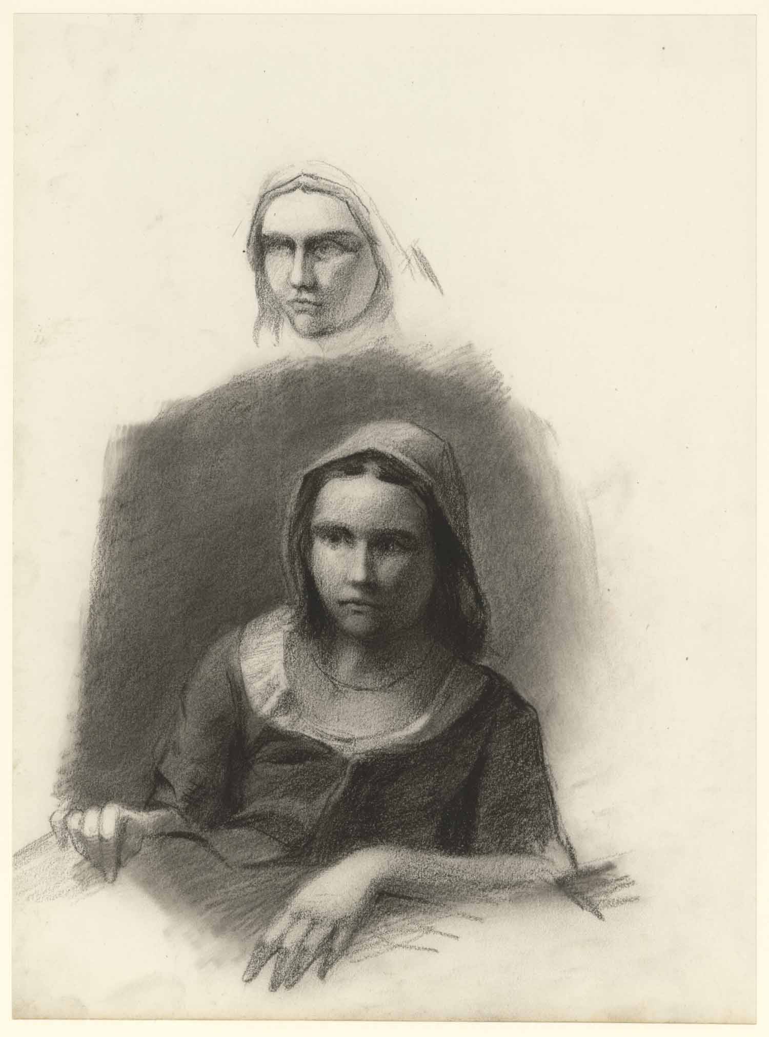 Studieblad met vrouwenhoofd en vrouw ten halve lijve