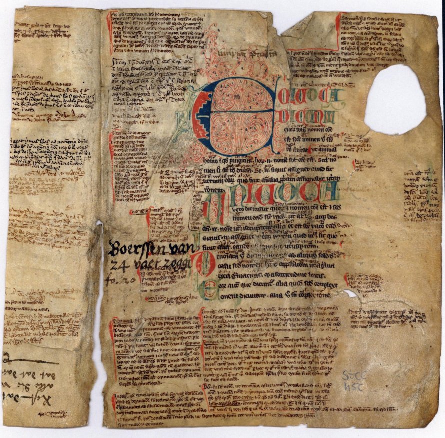 Fragment met tekst, blauwe kapitaal E en rond gat