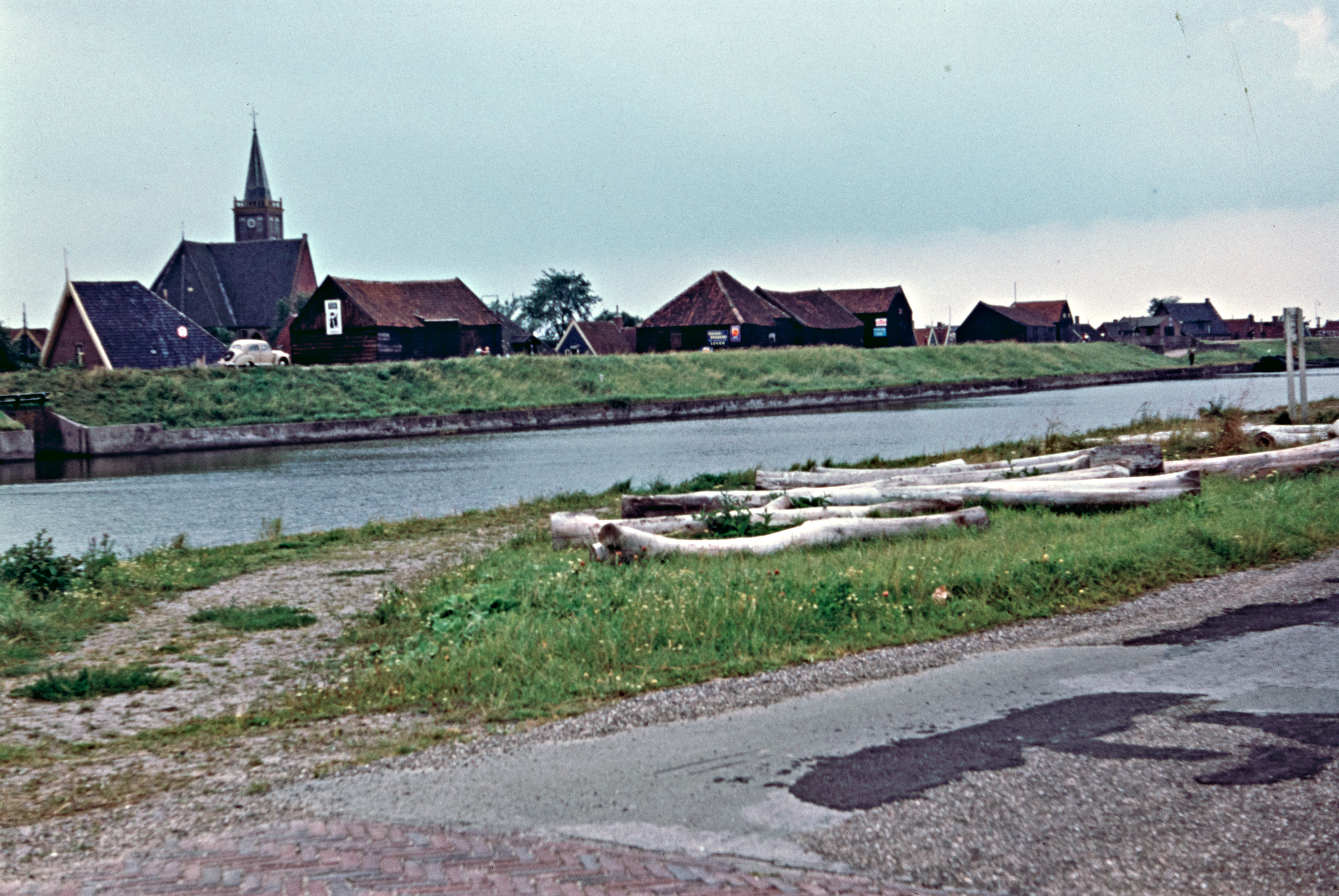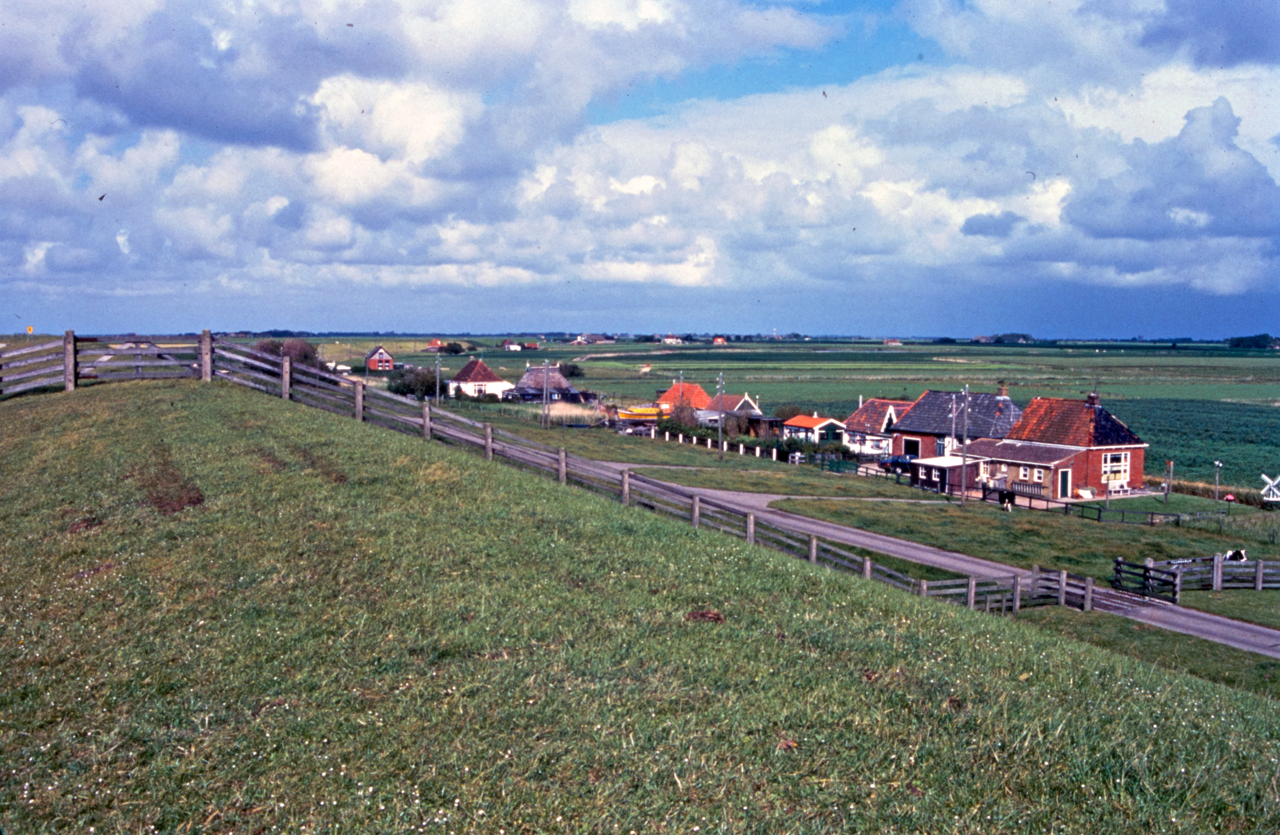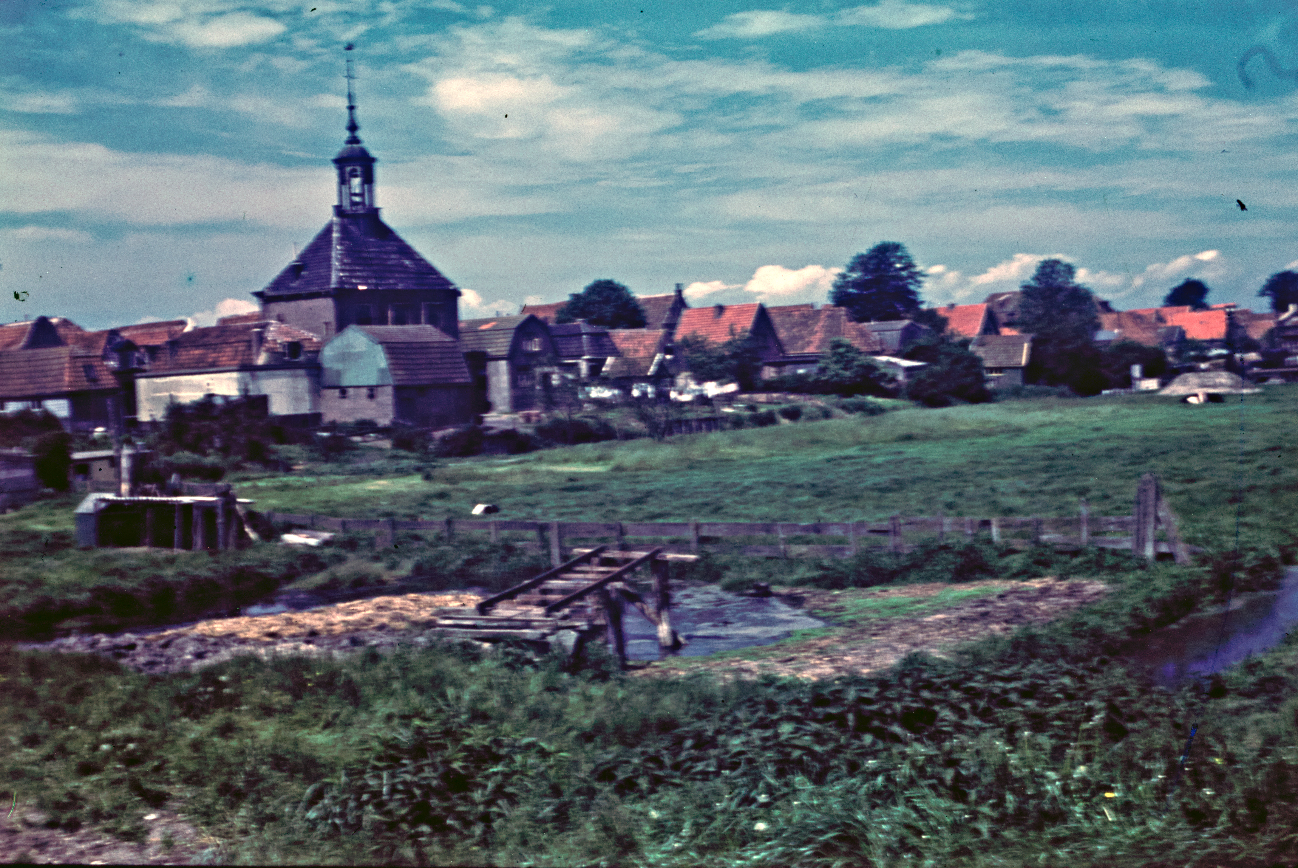 Kuinre gezien vanaf een boerenerf, raadhuis in de verte
