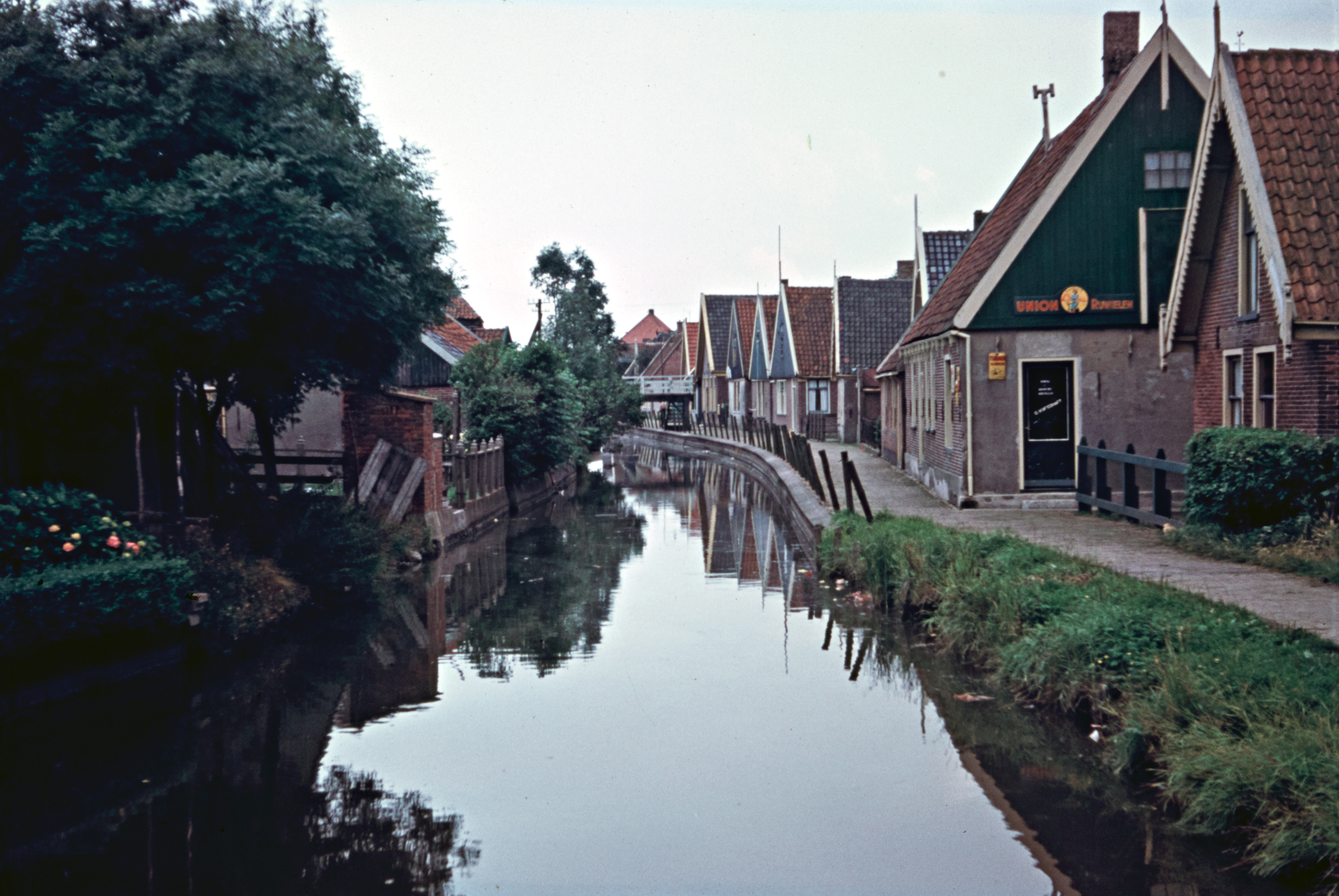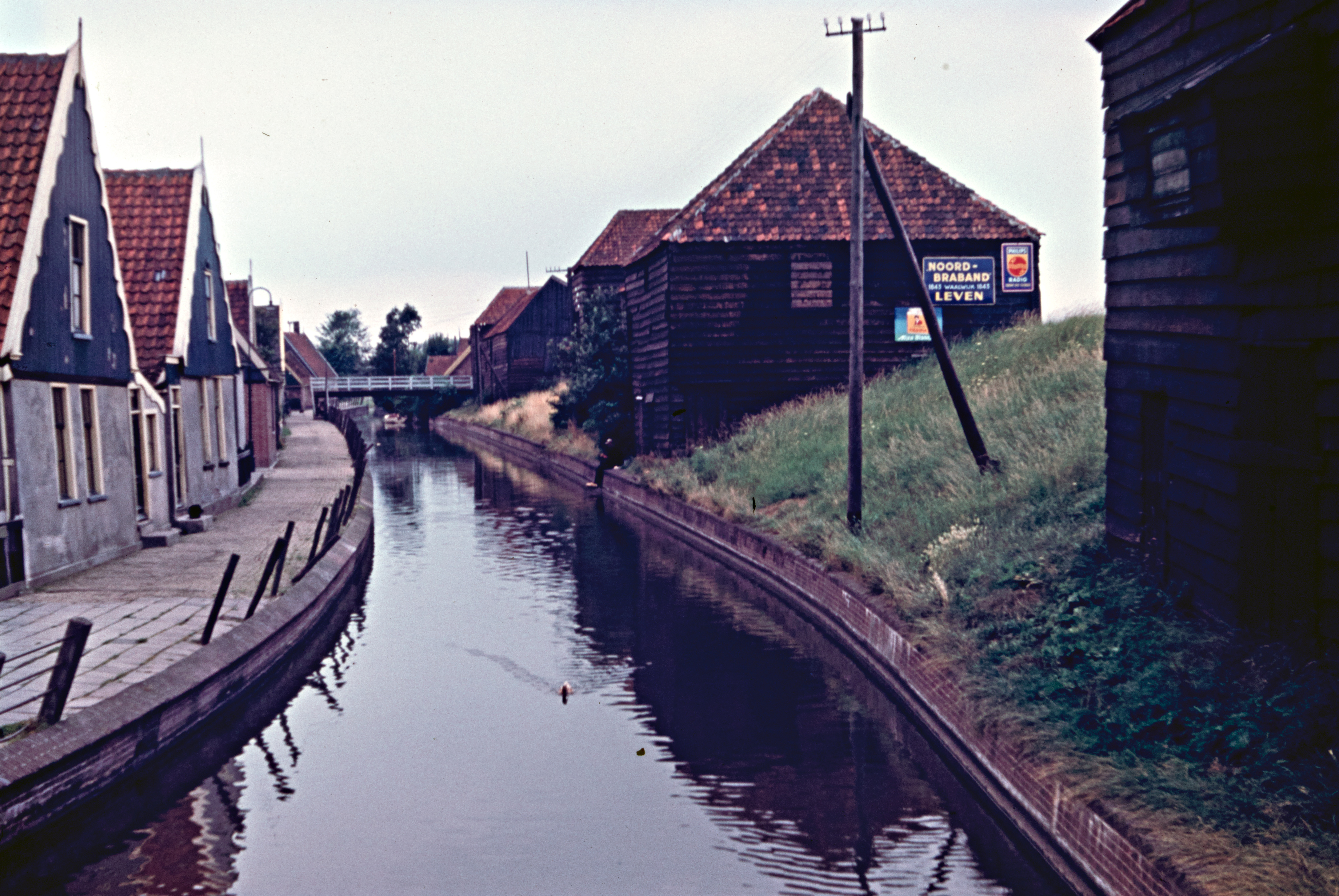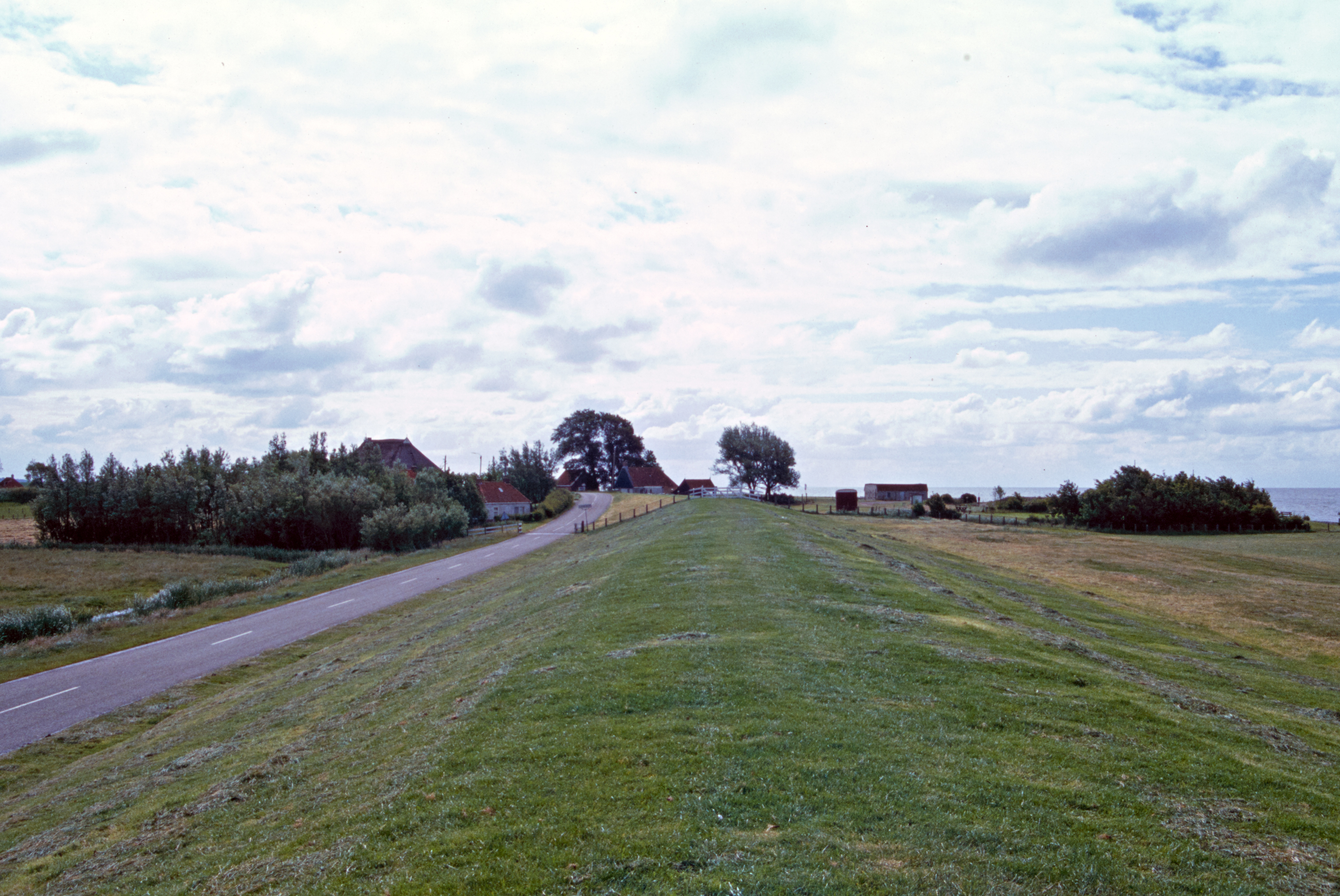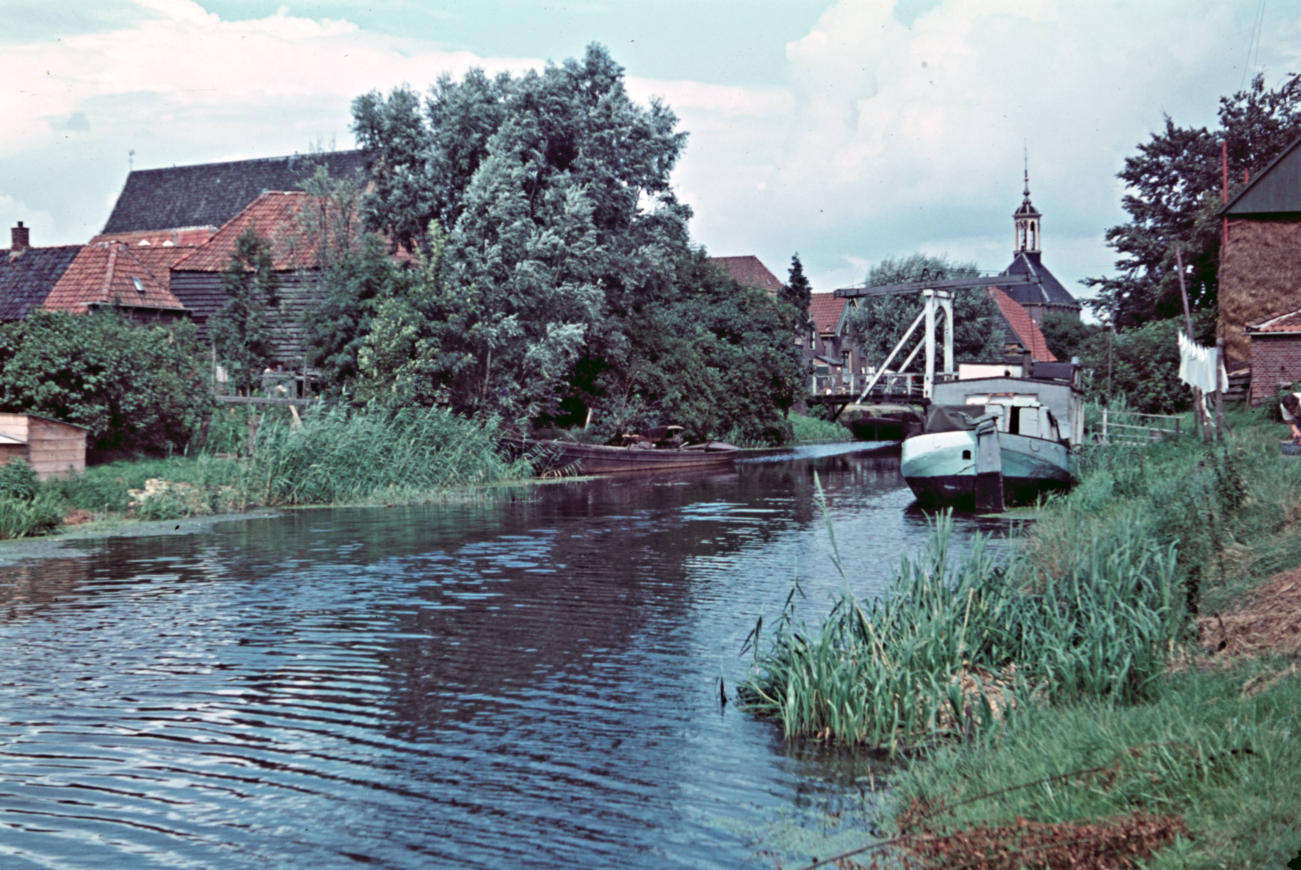 Kuinre gezien vanaf een boerenerf, raadhuis in de verte