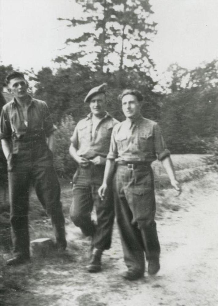 drie Britse militairen in open plek in bosgebied