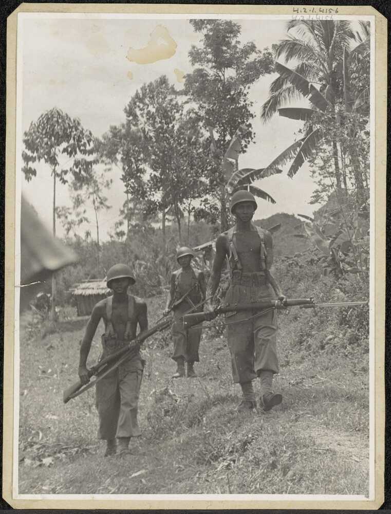 Foto van drie Indonesische KNIL soldaten op patrouil...