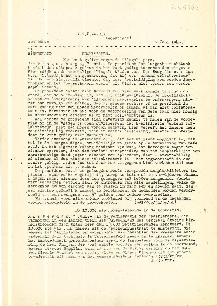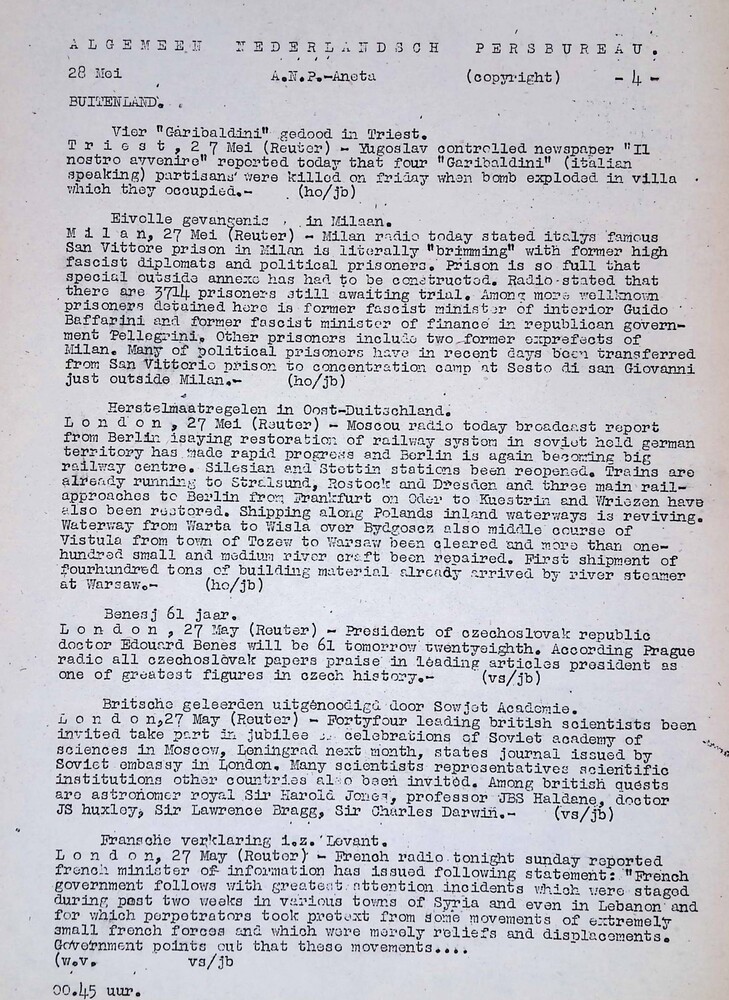 Algemeen Nederlandsch Persbureau, mededelingen, 28 m...