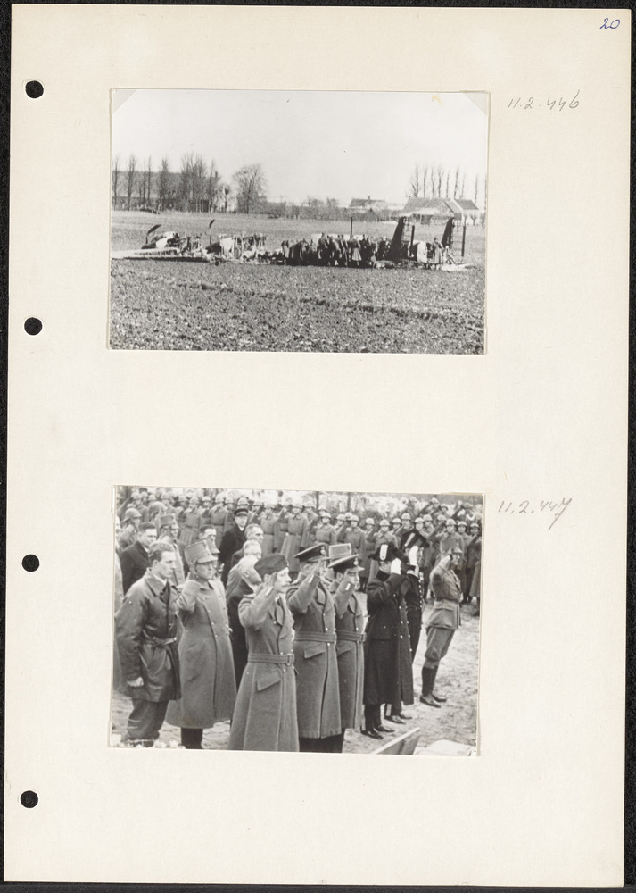 Foto Duitse militairen bij vliegtuigwrak. Tekst: "Wr...