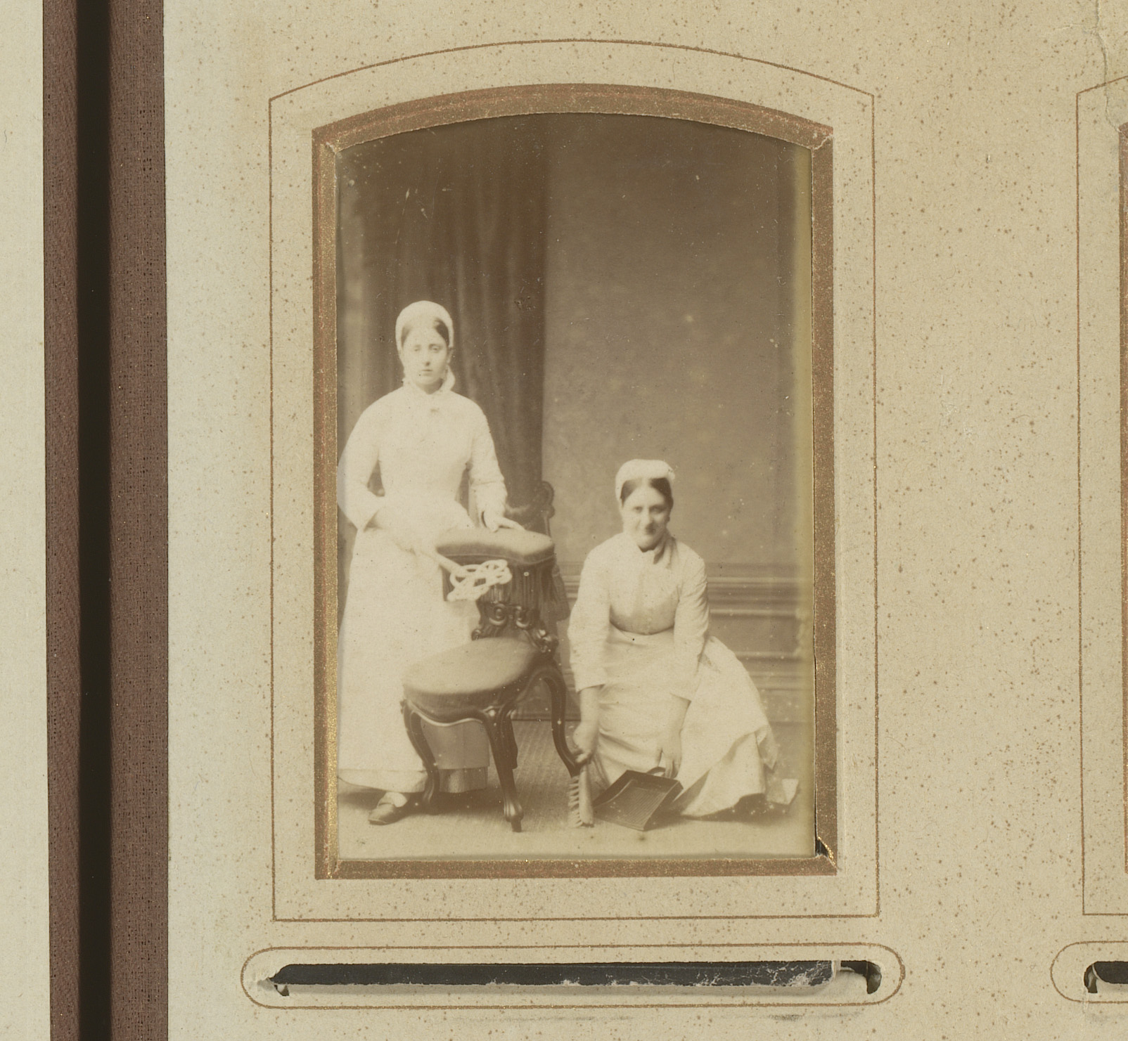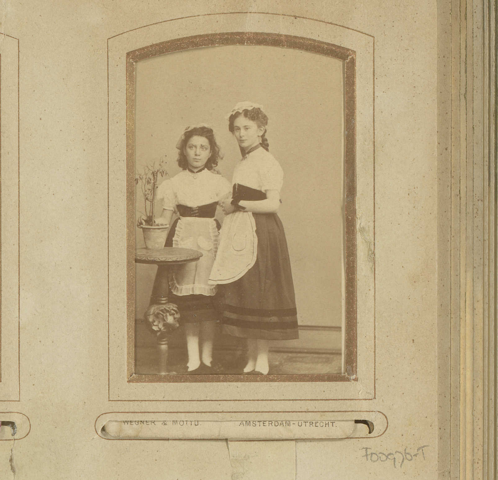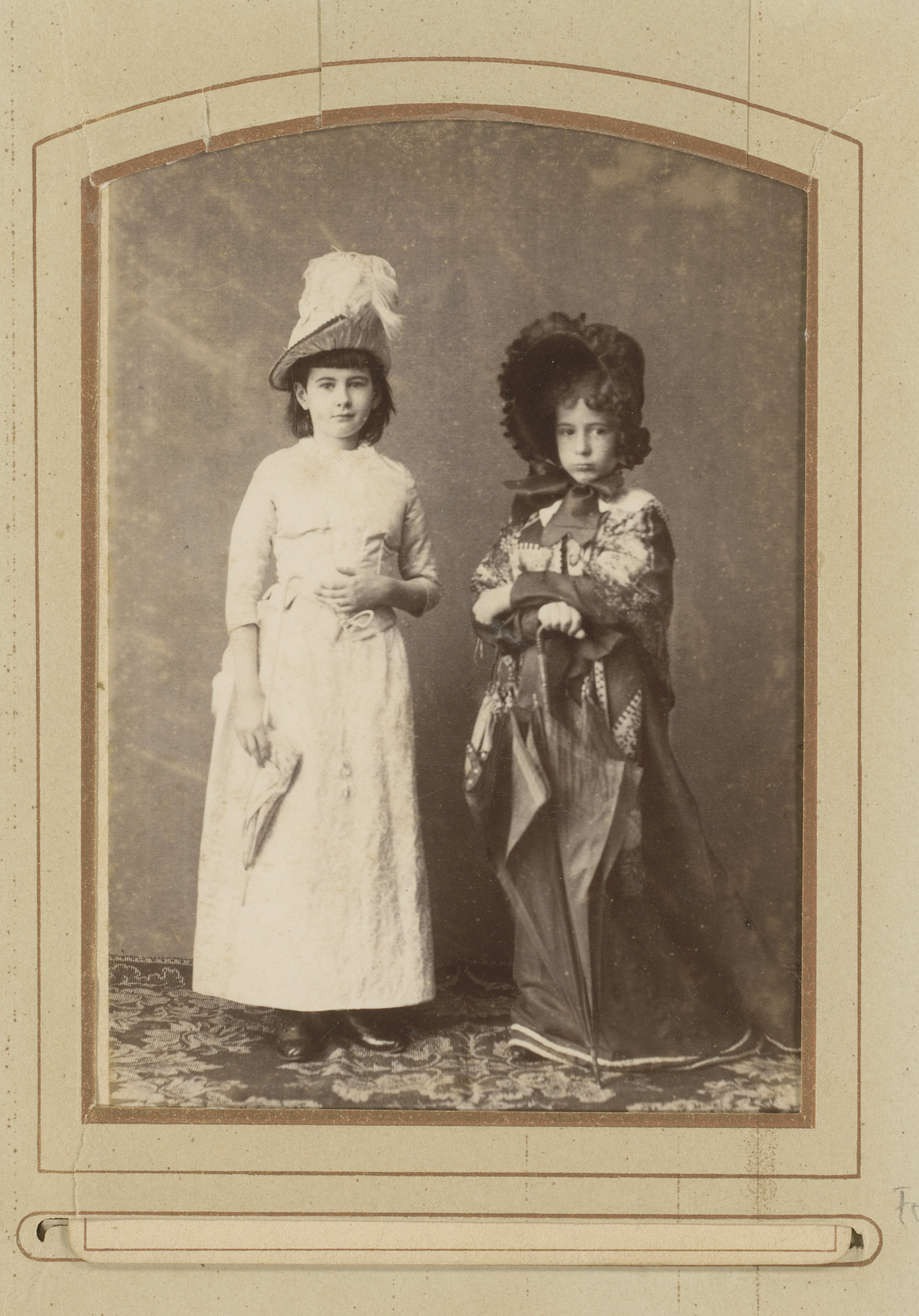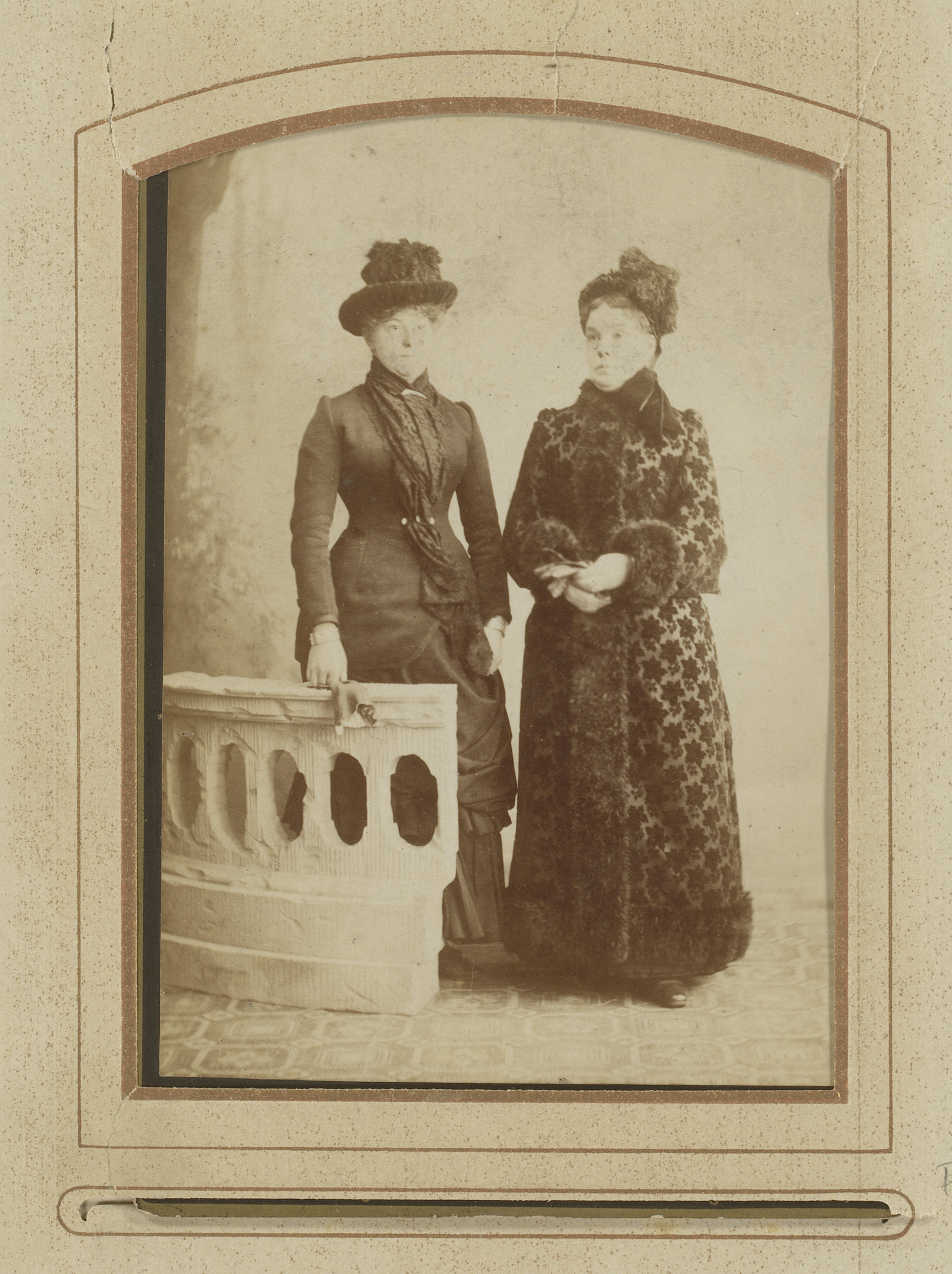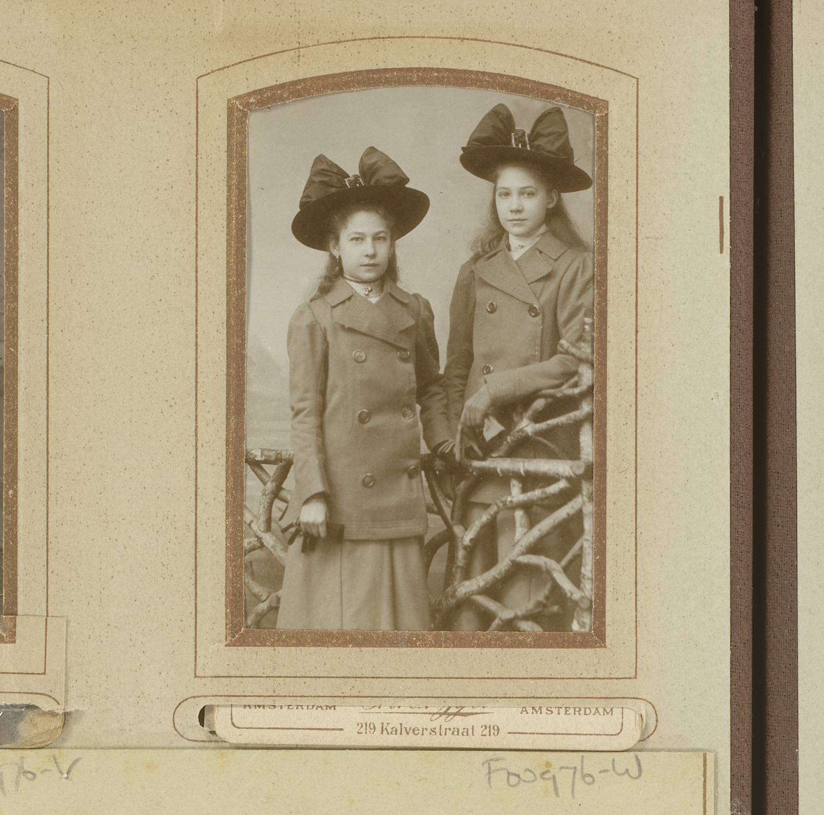 Portret van twee vrouwen met hoeden, staand bij een ...