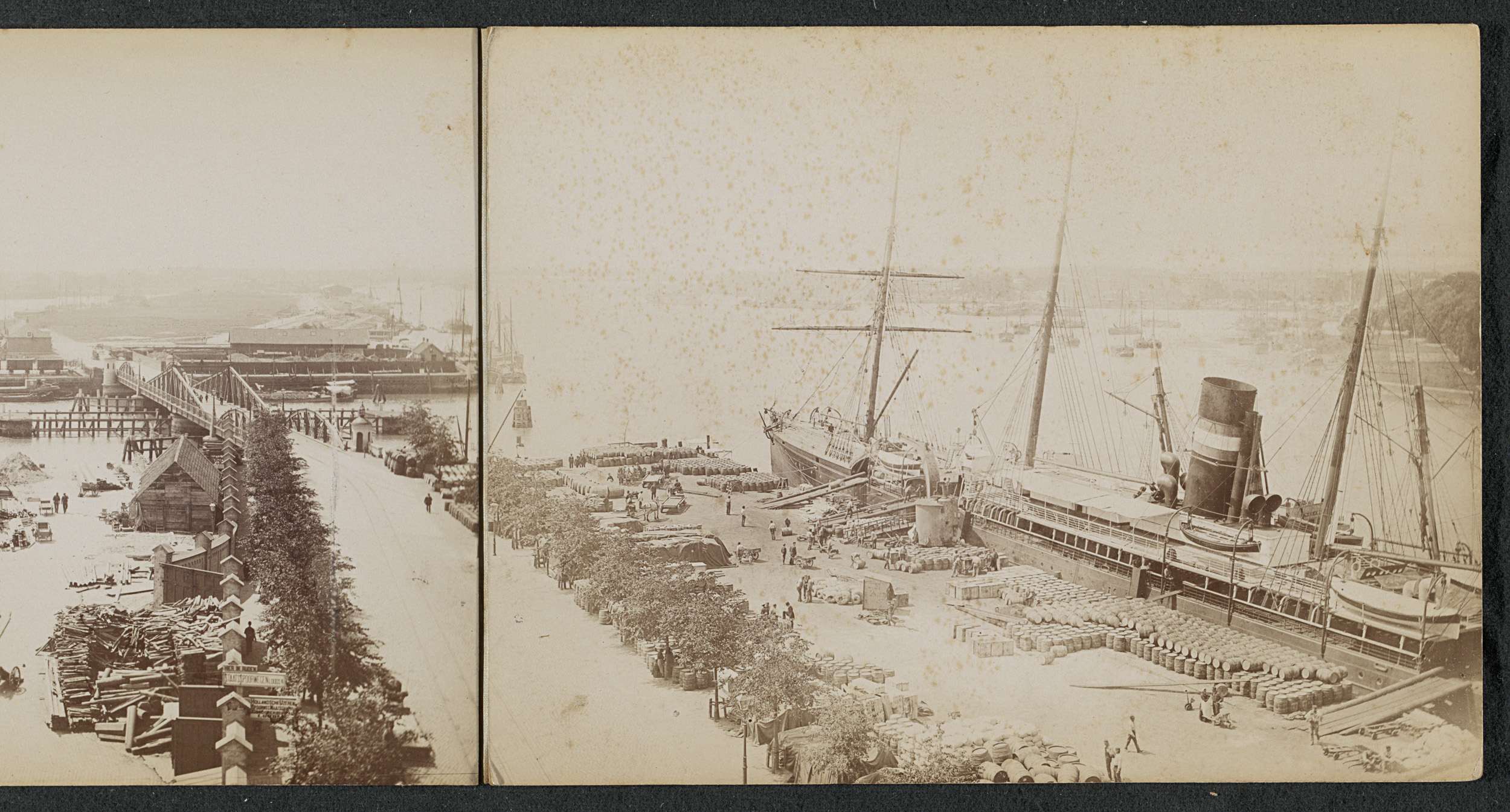 Gezicht op de het haventerrein en een stoomboot ter ...