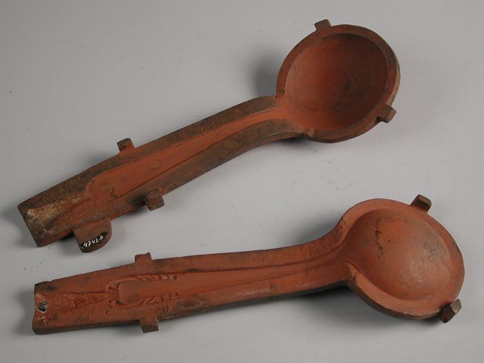 Tweedelige bronzen mal voor opscheplepel met bladran...