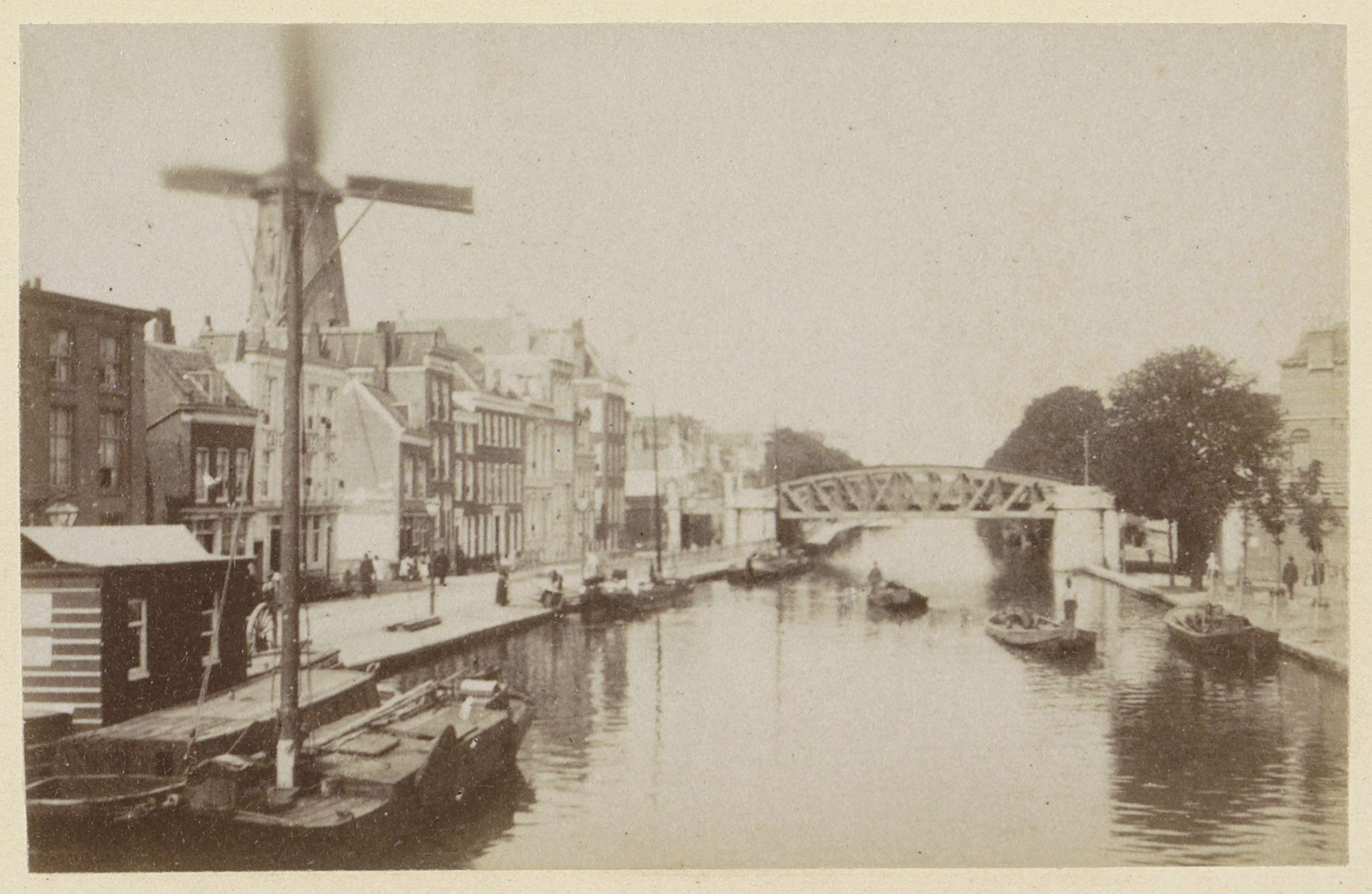 Gezicht op de Schiekade in Rotterdam met brug en molen