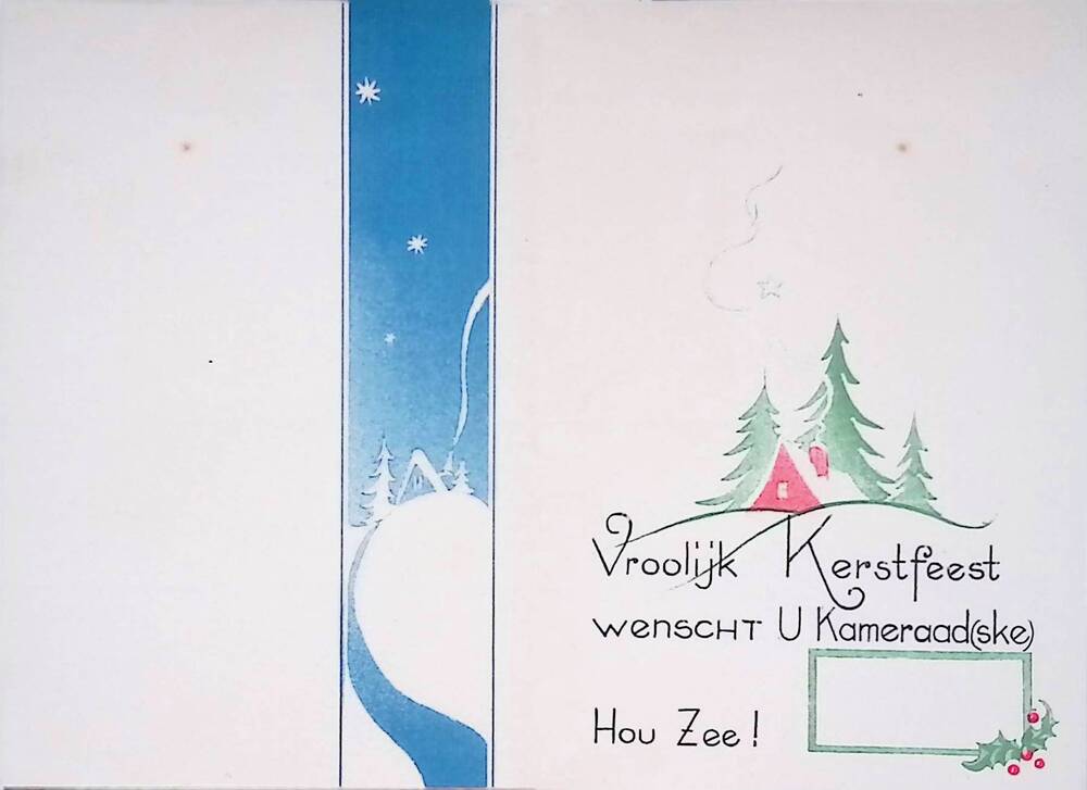 Kerstkaart met tekst "Vrolijk Kerst Feest" en "Vroli...