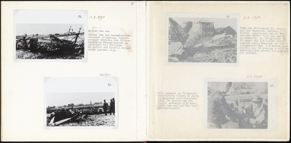 Foto uitgebrand wrak vliegtuig. Drie Duitse militair...