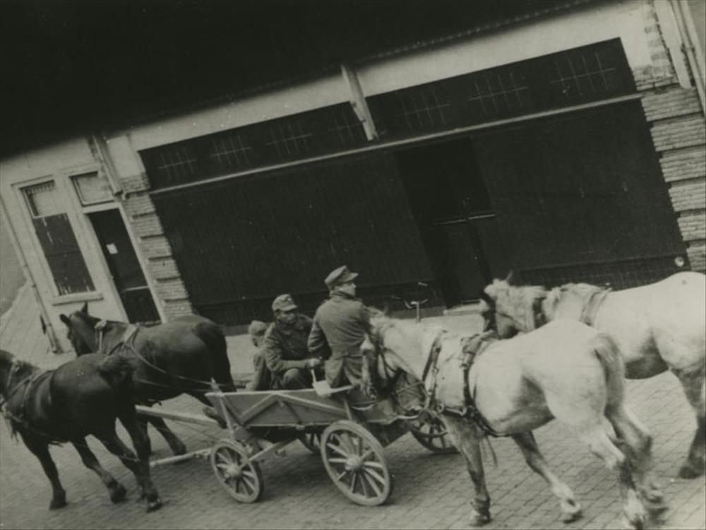 Foto van Duitse militairen in wagen met paarden in e...
