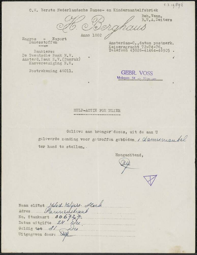 Brief van C.V. Eerste Nederlandsche Dames- en Kinder...