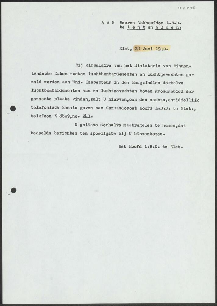 Brief d.d. 28-06-1940 van LBD Elst aan Vakhoofden LB...