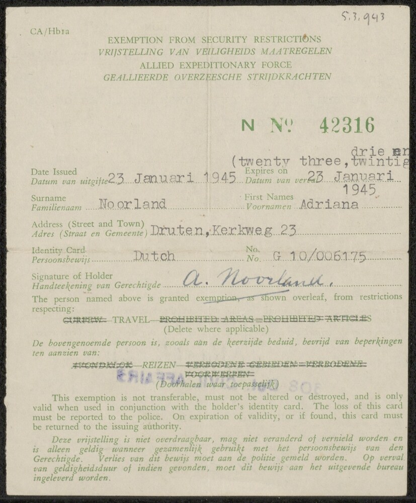 Vrijstelling/Permit, A. Noorland, 23 januari 1945