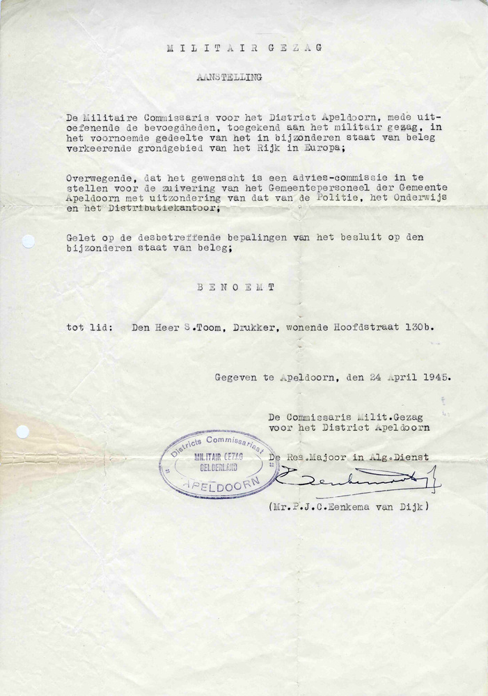 aanstellingsbrief op naam van S. Toom tot lid advies...