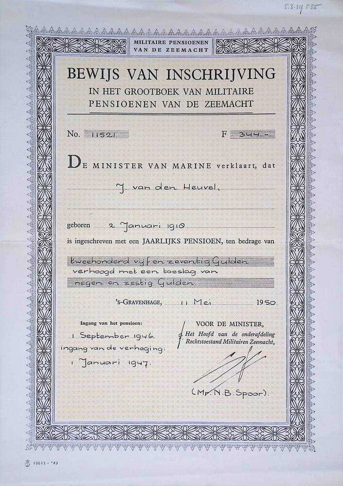 Bewijs van inschrijving van J. van den Heuvel .