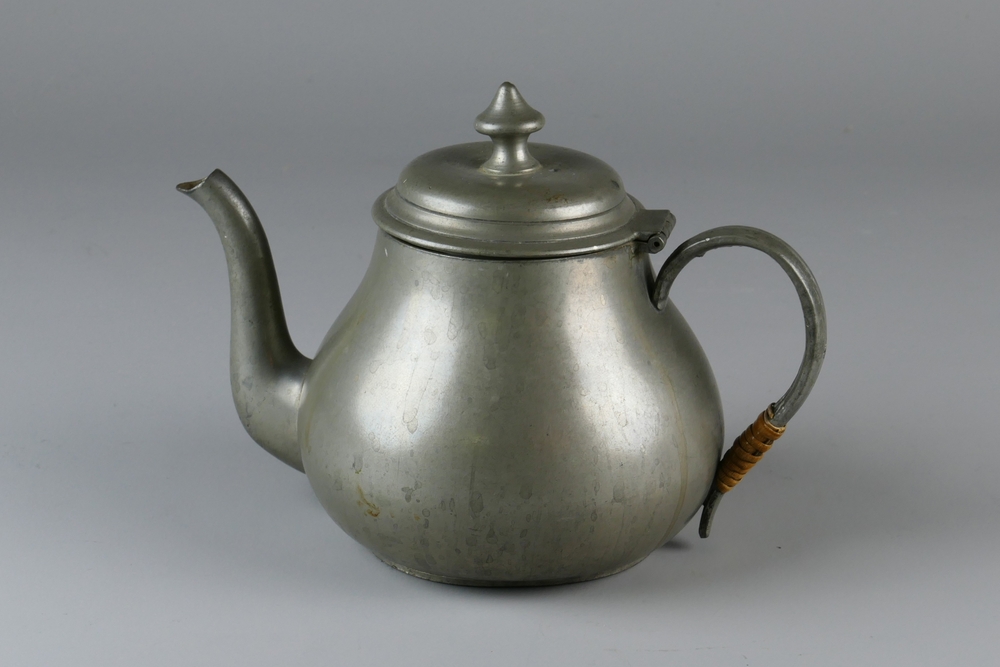 theeservies van tin, vervaardigd door Meeuws en Zoon...