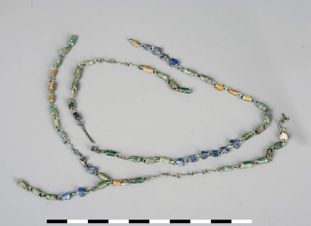 Halsketting van brons met glazen kralen uit de Romei...