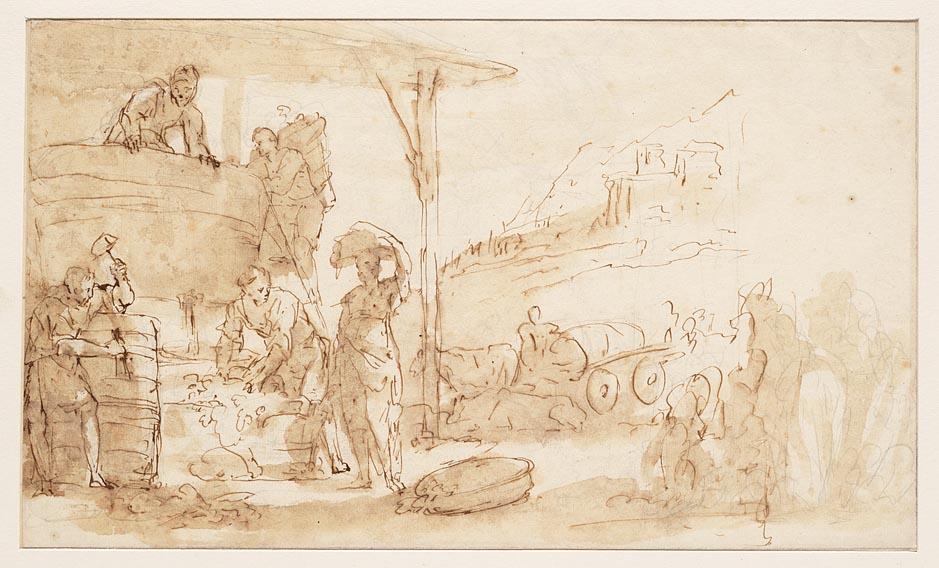 Studieblad met werkende personen (druivenoogst, wijn...