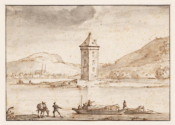 Gezicht op de Muizentoren in de Rijn, links op de ac...
