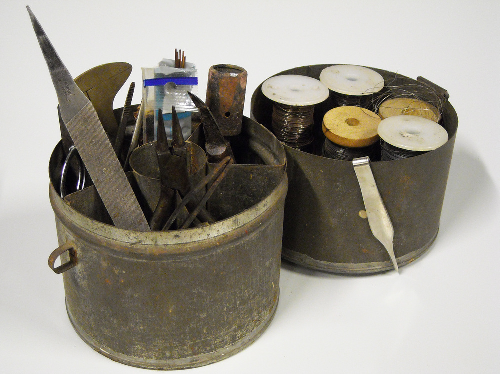 Blikje met divers gereedschap en binddraad