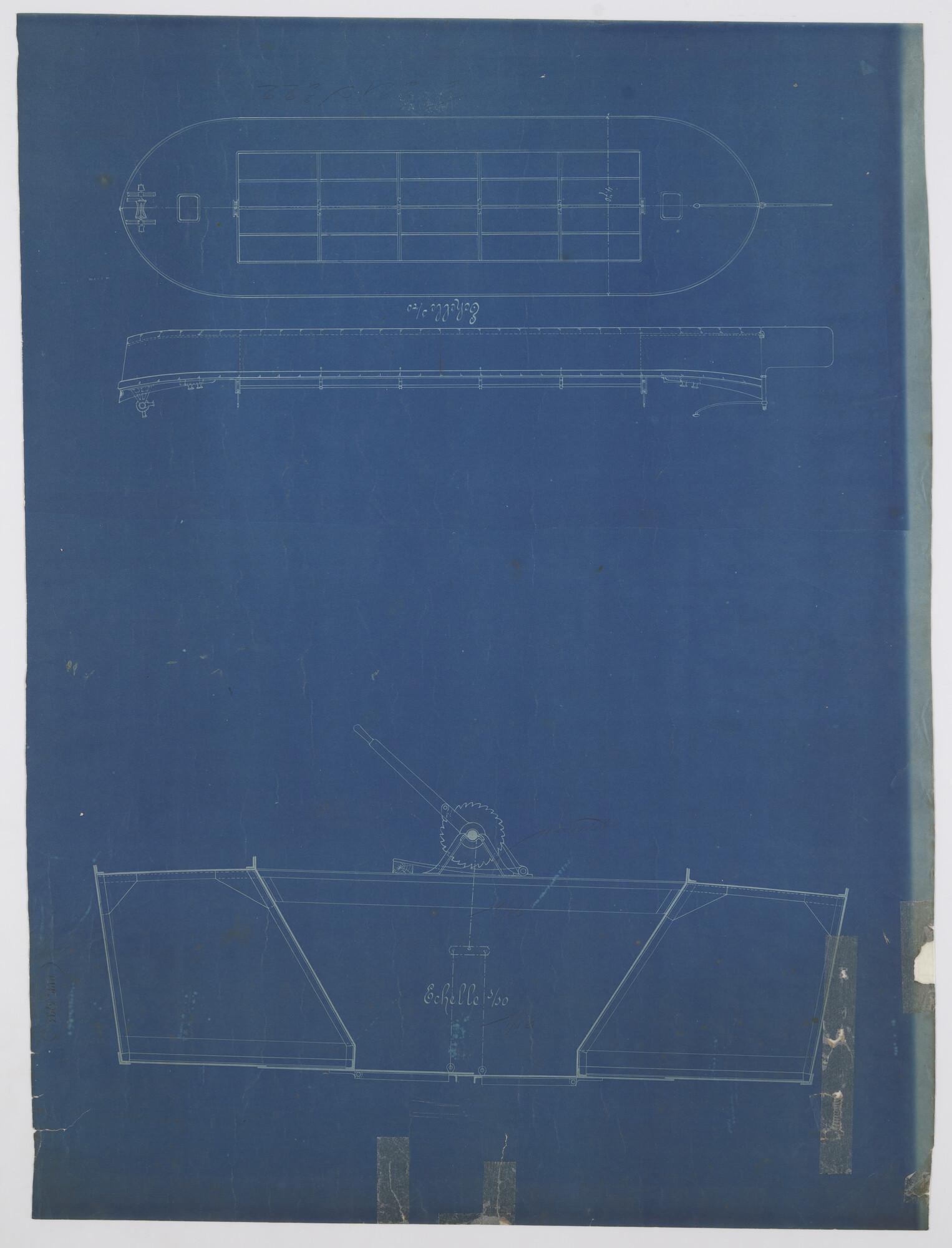 Constructietekening vlak, zij en dek van drijvende b...