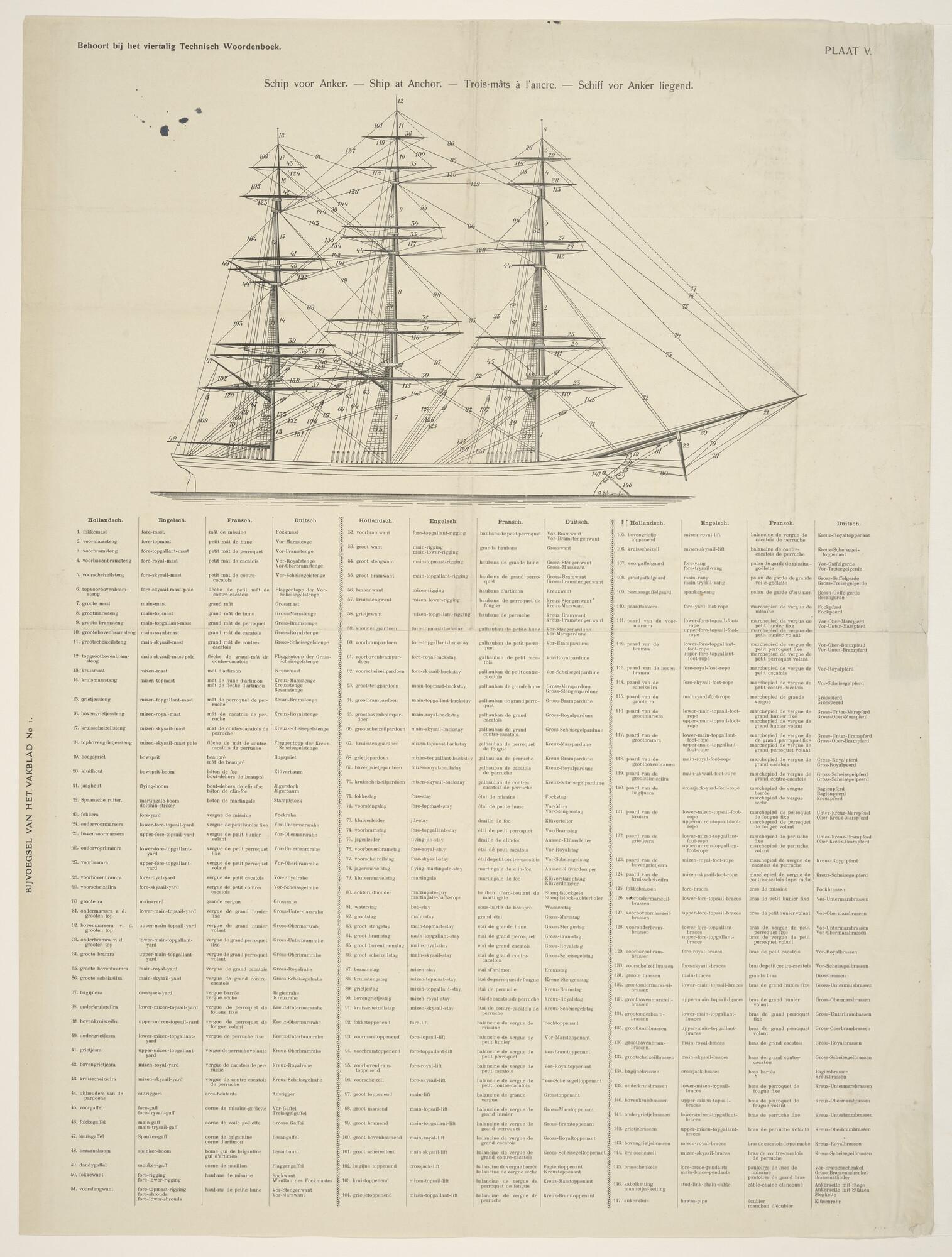 Tuigtekening van een koopvaardijfregat voor anker