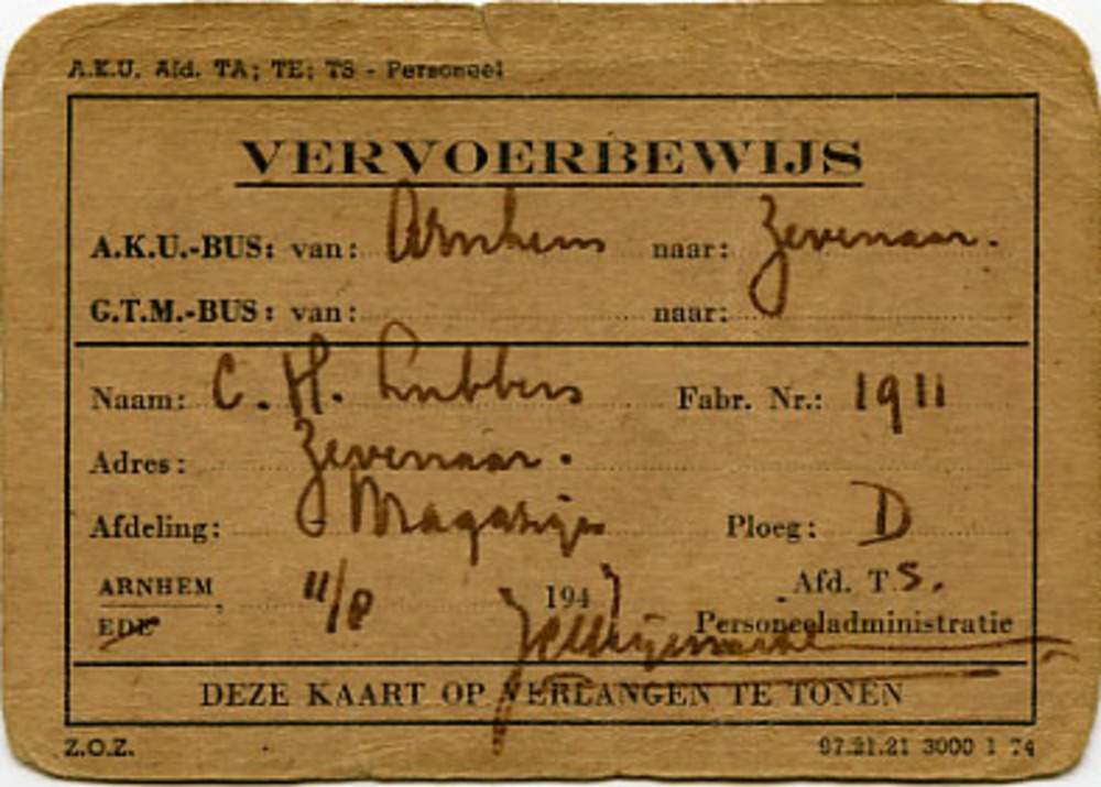 Vervoerbewijs van papier voor de A.K.U.-bus van Arnh...
