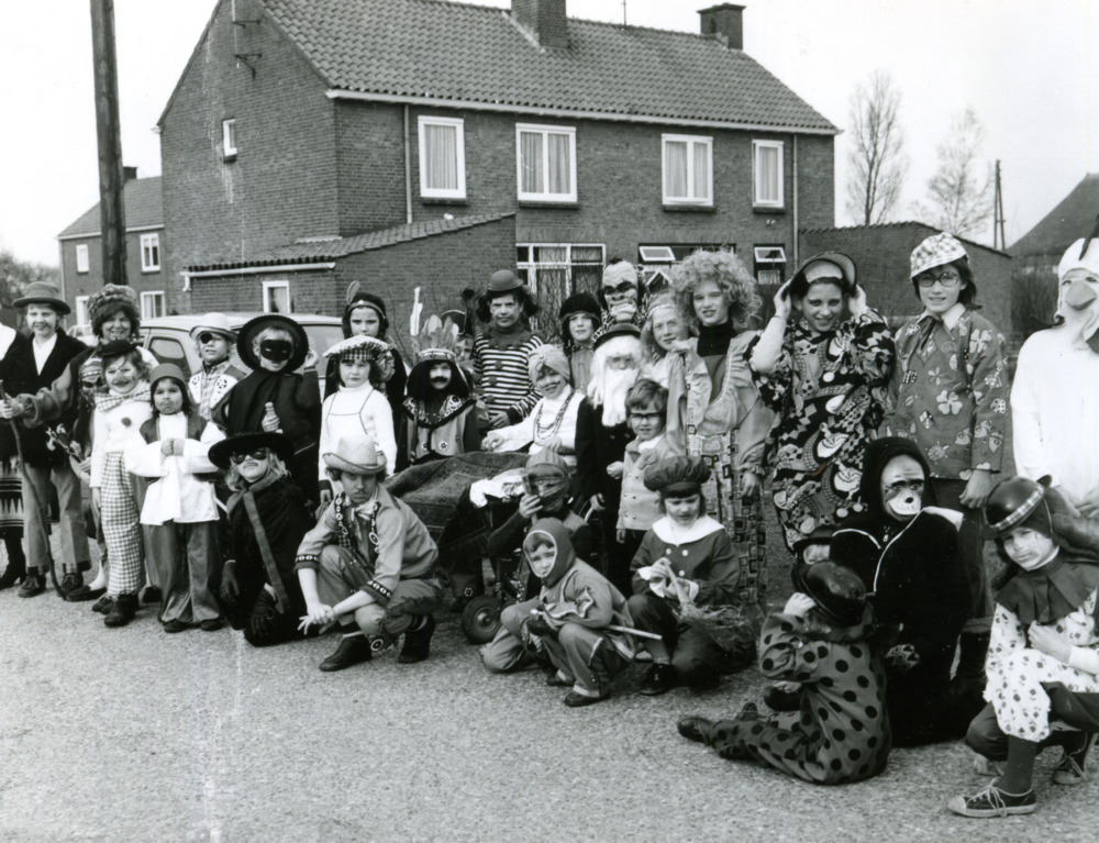 Zwart-wit foto van het kindercarnaval in Aerdt 1974