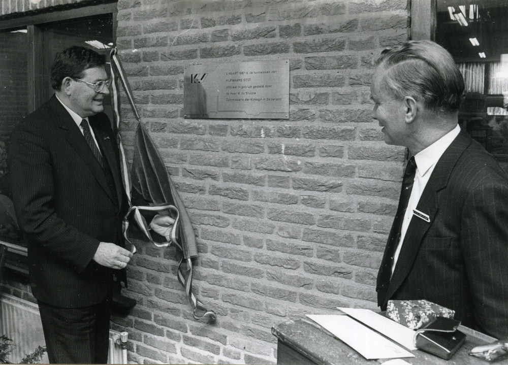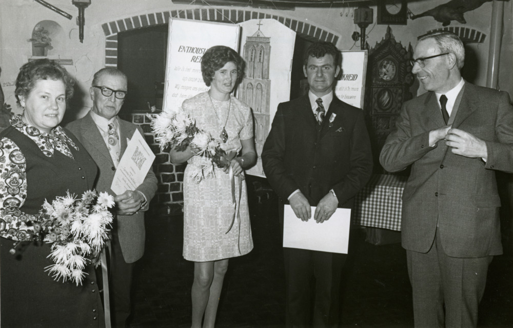 Zwart-wit foto van uitreiking van een onderscheiding...